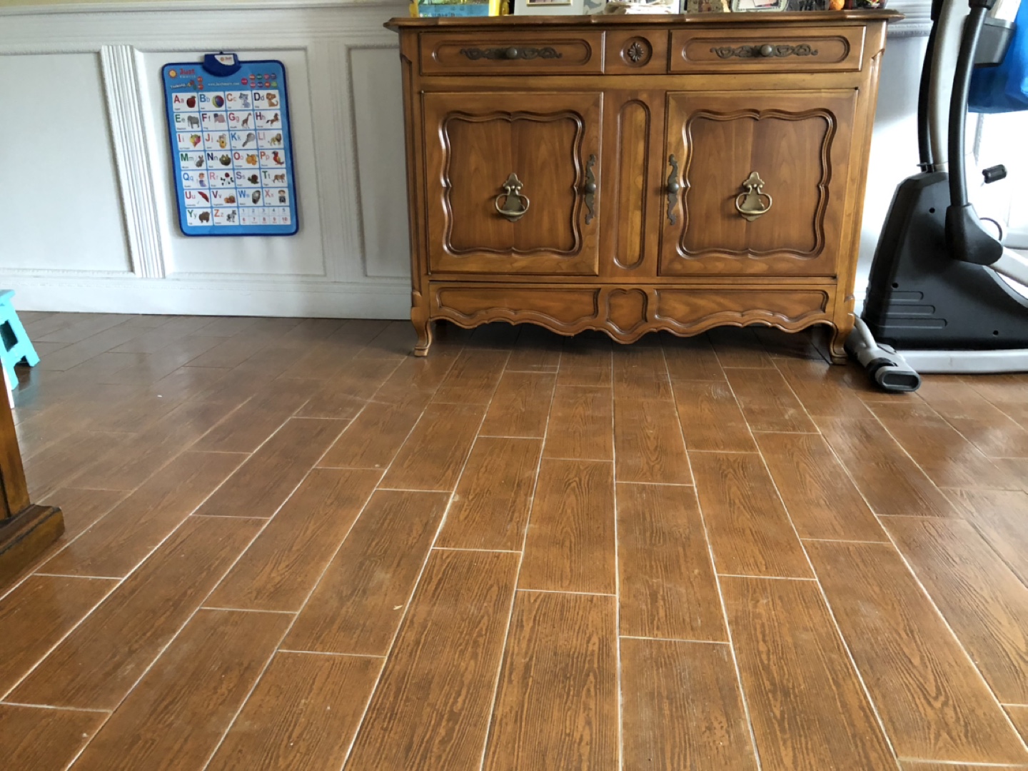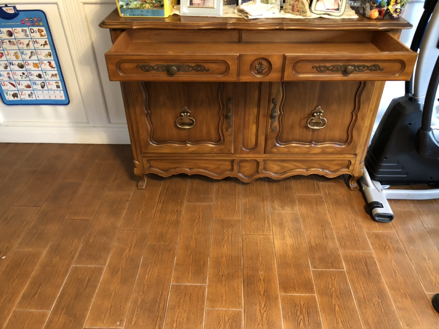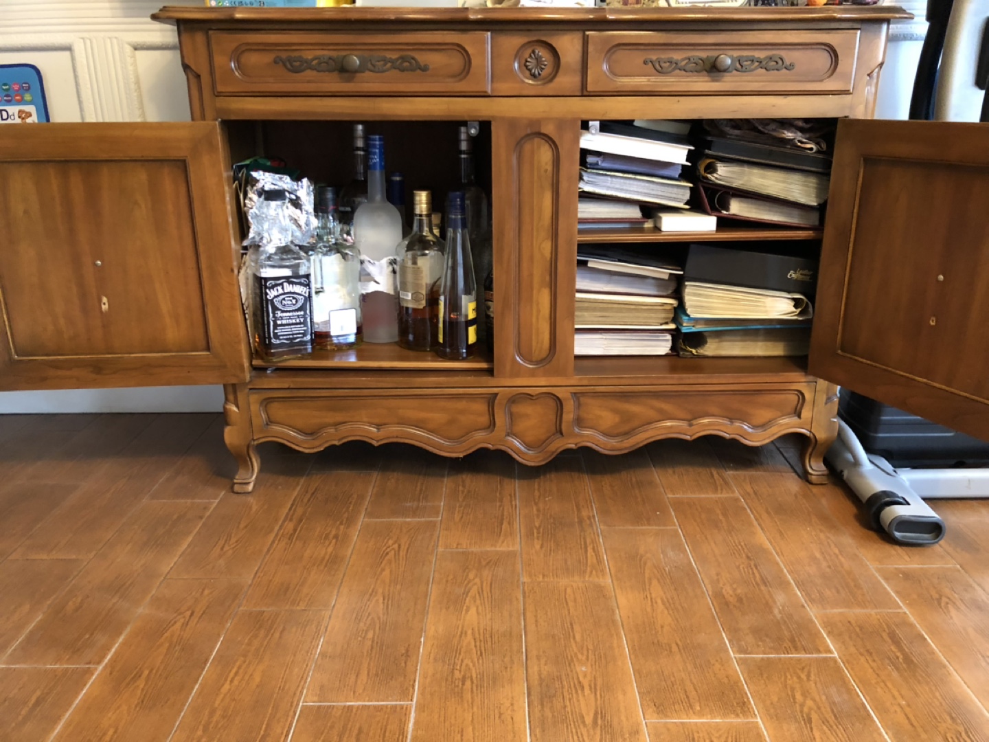 Wooden sideboard cabinet. Two doors, two drawers. Ornate detailing. Brass hardware. Ample storage space. French provincial style.
