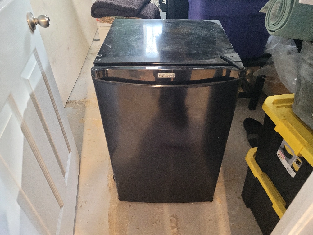Small black refrigerator. Ideal for dorm room or small space. Features adjustable shelves and door storage. Used condition.