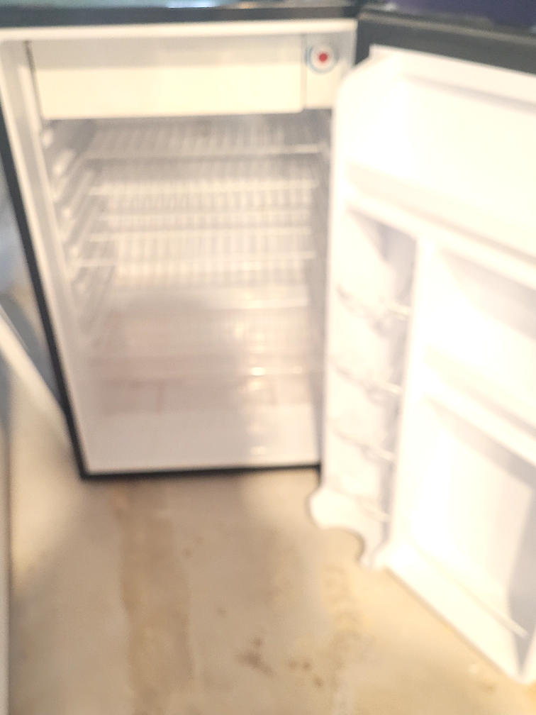 Small black refrigerator. Ideal for dorm room or small space. Features adjustable shelves and door storage. Used condition.