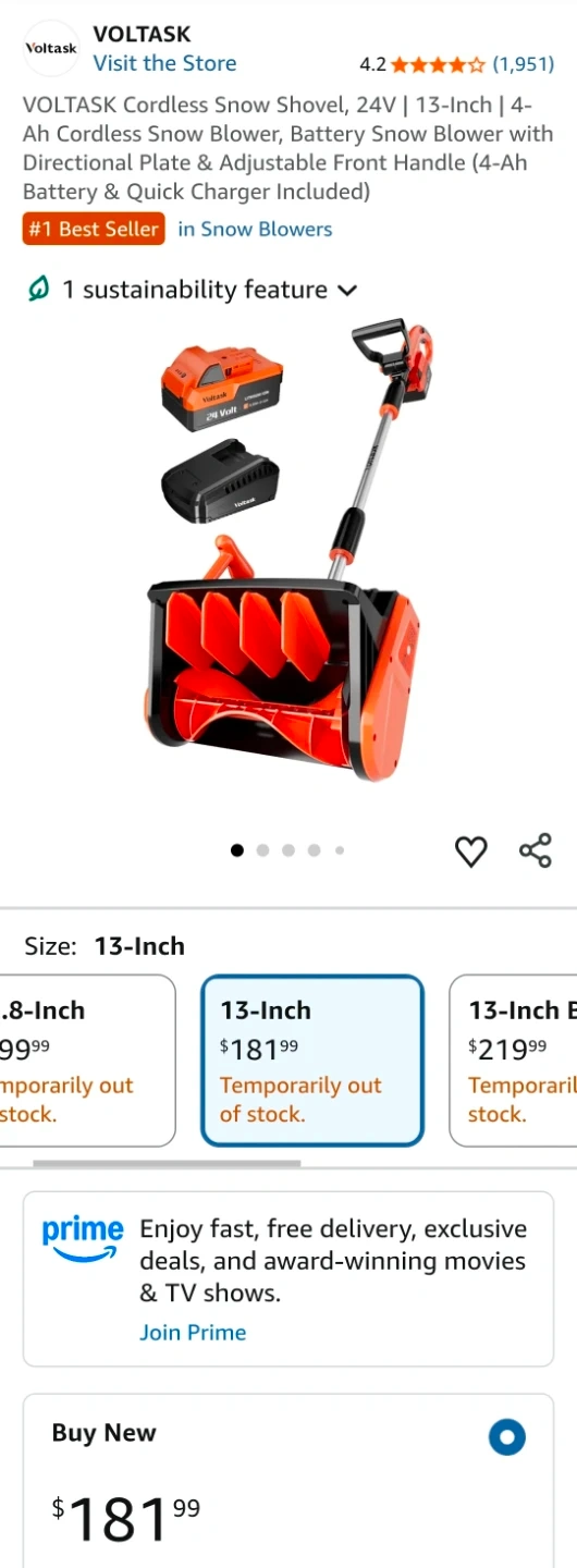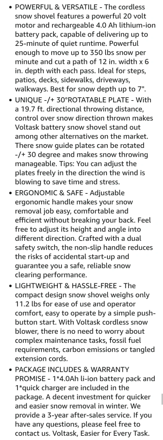 I am selling a Voltask cordless snow shovel that features a powerful 20 volt motor and rechargeable 4.0 Ah lithium-ion battery pack.