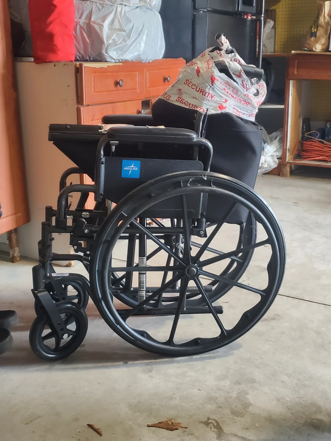 This is a Drive Medical Cruiser wheelchair. It's black and features large rear wheels and smaller front casters for easy manoeuvring. The seat and backrest are made of a durable nylon material.The Medline K1 Wheelchair: Rooted in Reliability