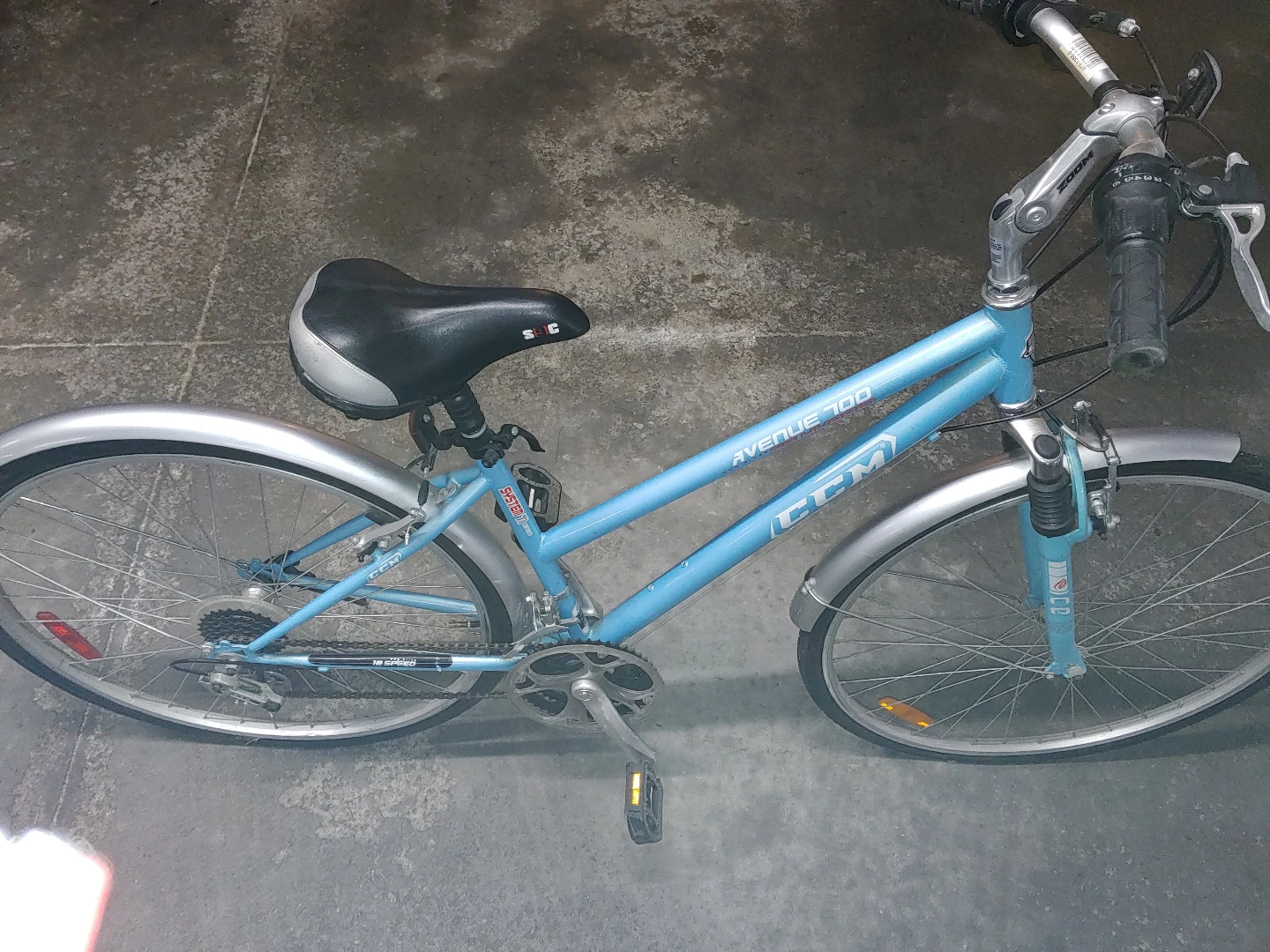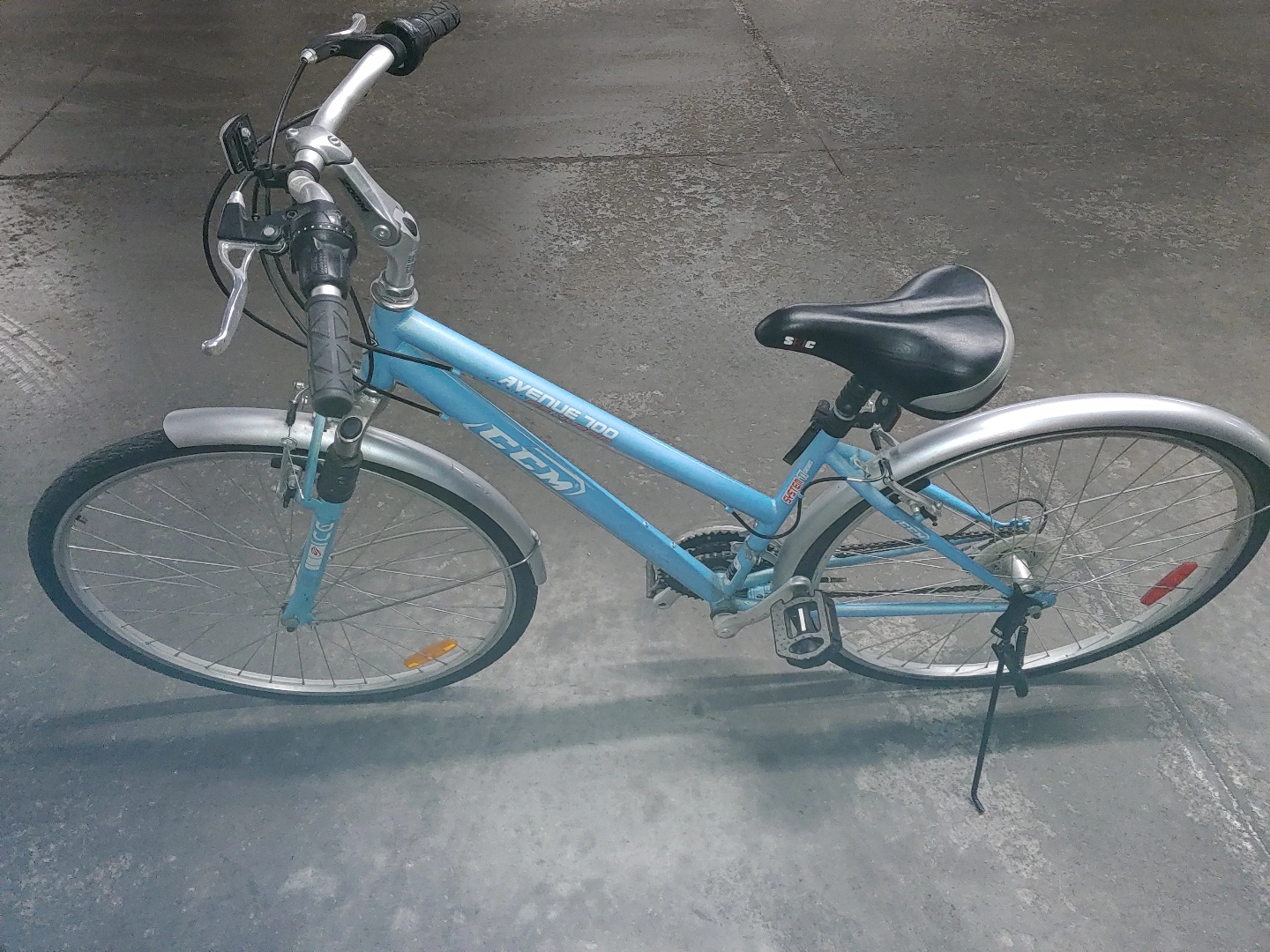 Lightly used CCM Avenue 100 Hybrid women's cruiser bicycle. Light blue frame. Mint condition. Rides well.