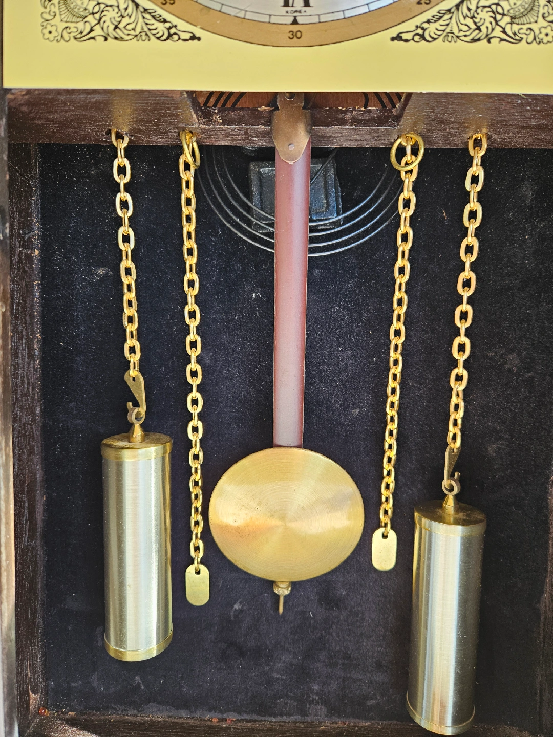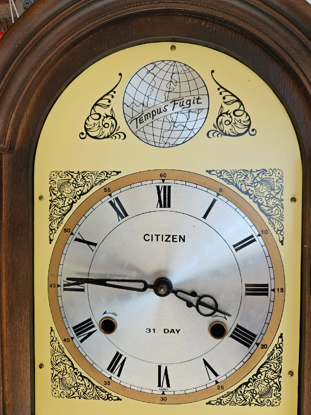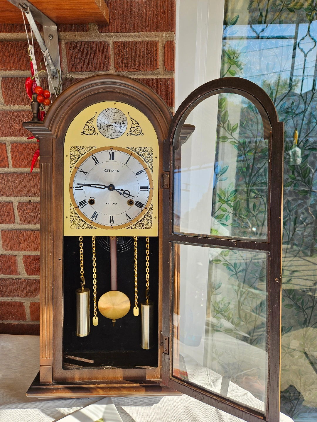 Selling a Citizen 31 Day wall clock. It features a classic design with Roman numerals and decorative details. The clock has a pendulum and weights. A winding key is included. An original!