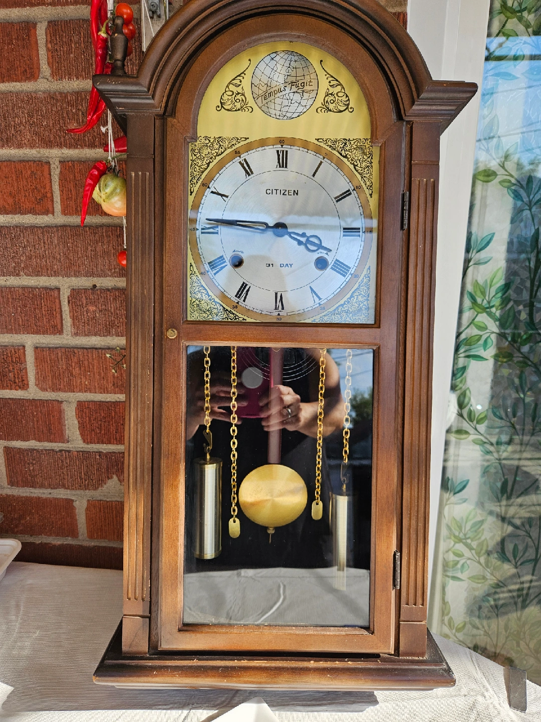 Selling a Citizen 31 Day wall clock. It features a classic design with Roman numerals and decorative details. The clock has a pendulum and weights. A winding key is included. An original!