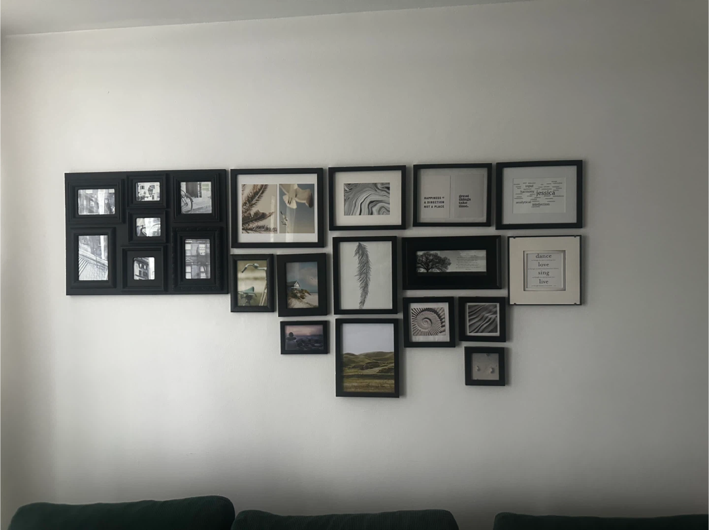 This is a black gallery wall set with multiple picture frames. It includes a multi-photo frame with 7 openings and several individual frames of various sizes. The frames are perfect for displaying a collection of cherished memories or artwork.