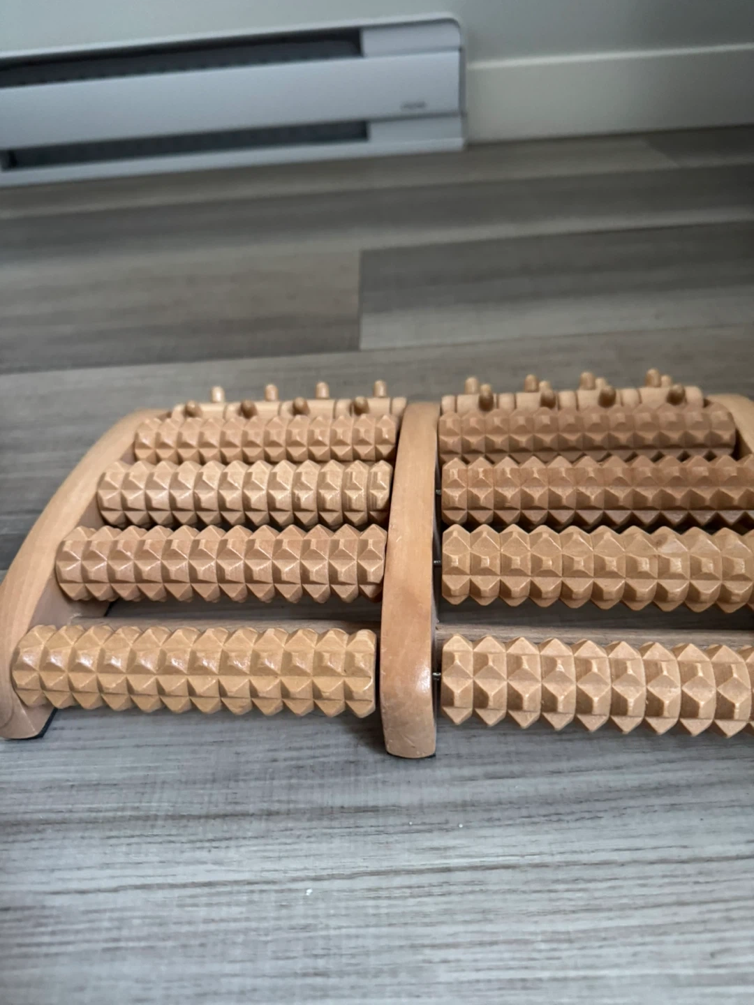 Wooden foot roller massager with multiple rollers. It's made of natural wood and has a durable construction. This foot roller helps to relieve foot tension and fatigue.