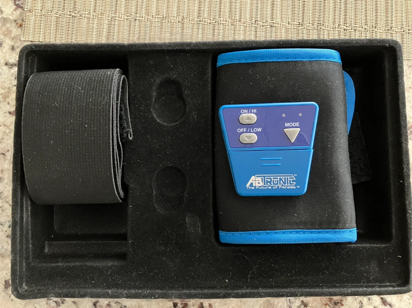 ABRONIC EMS Toning Belt with ON/HI and OFF/LOW intensity settings, and a MODE button. Comes with an additional black elastic strap. This belt is designed for muscle toning.