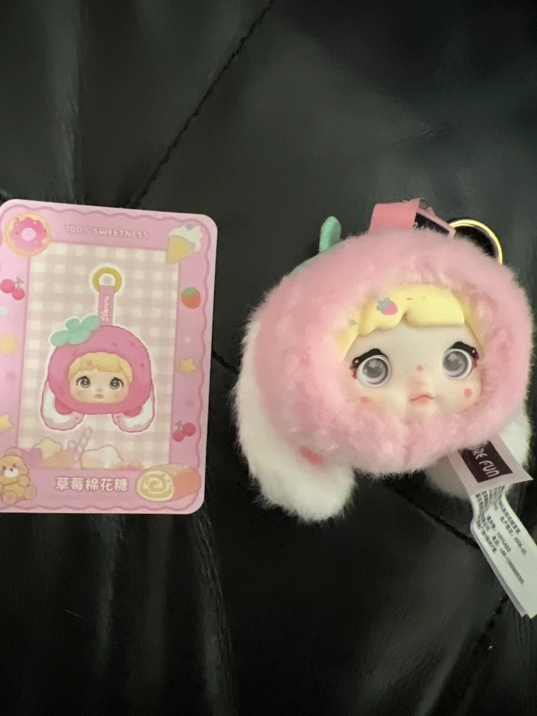 This is a Nommi 100% Sweetness plush toy, featuring a strawberry cotton candy design. It's a fluffy and adorable collectible item. The plush comes with its original packaging and a collectible card.