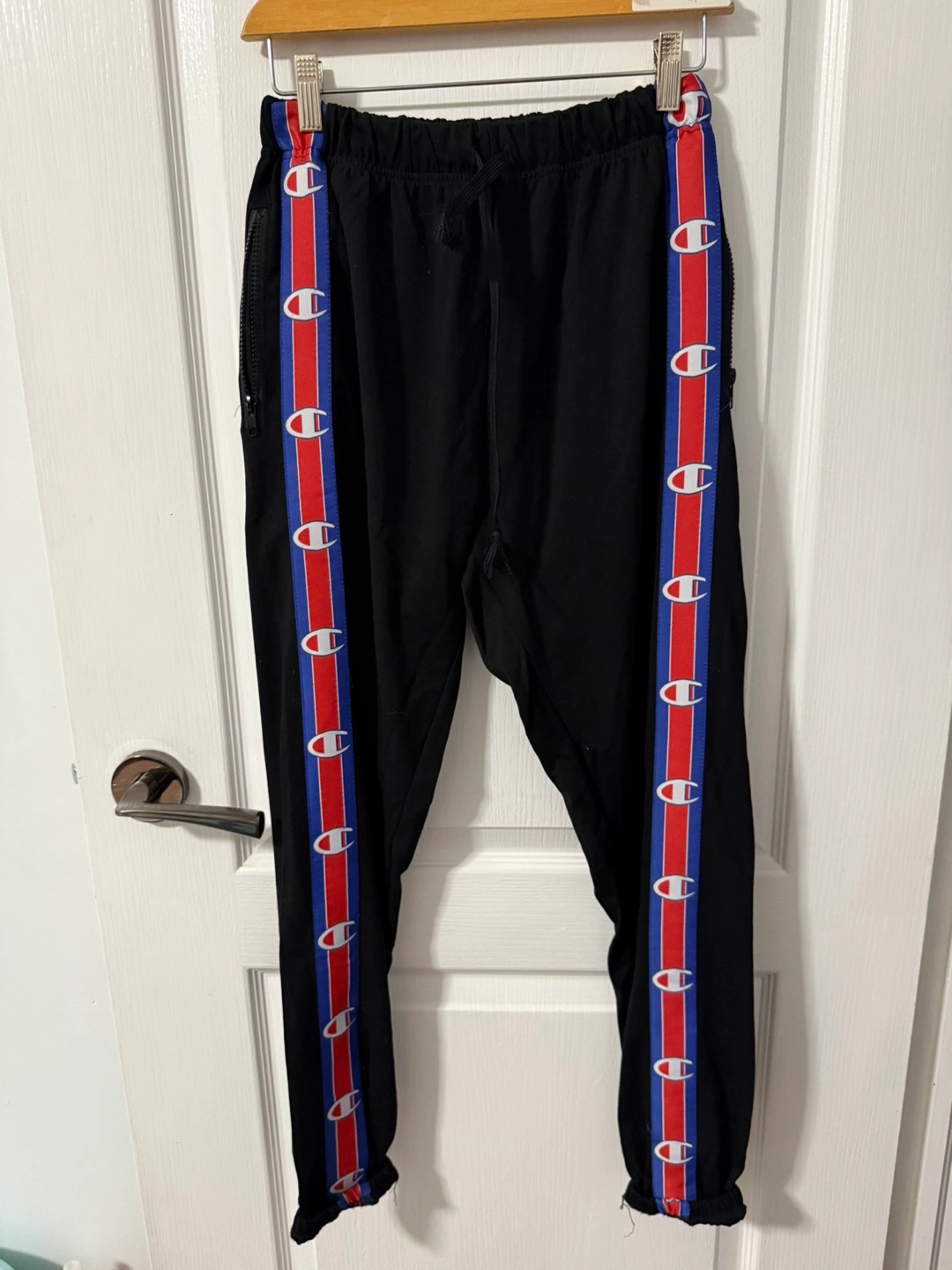 Selling a pair of track pants in black! They have a cool red and blue stripe design down the sides with a logo. Perfect for lounging or hitting the gym!