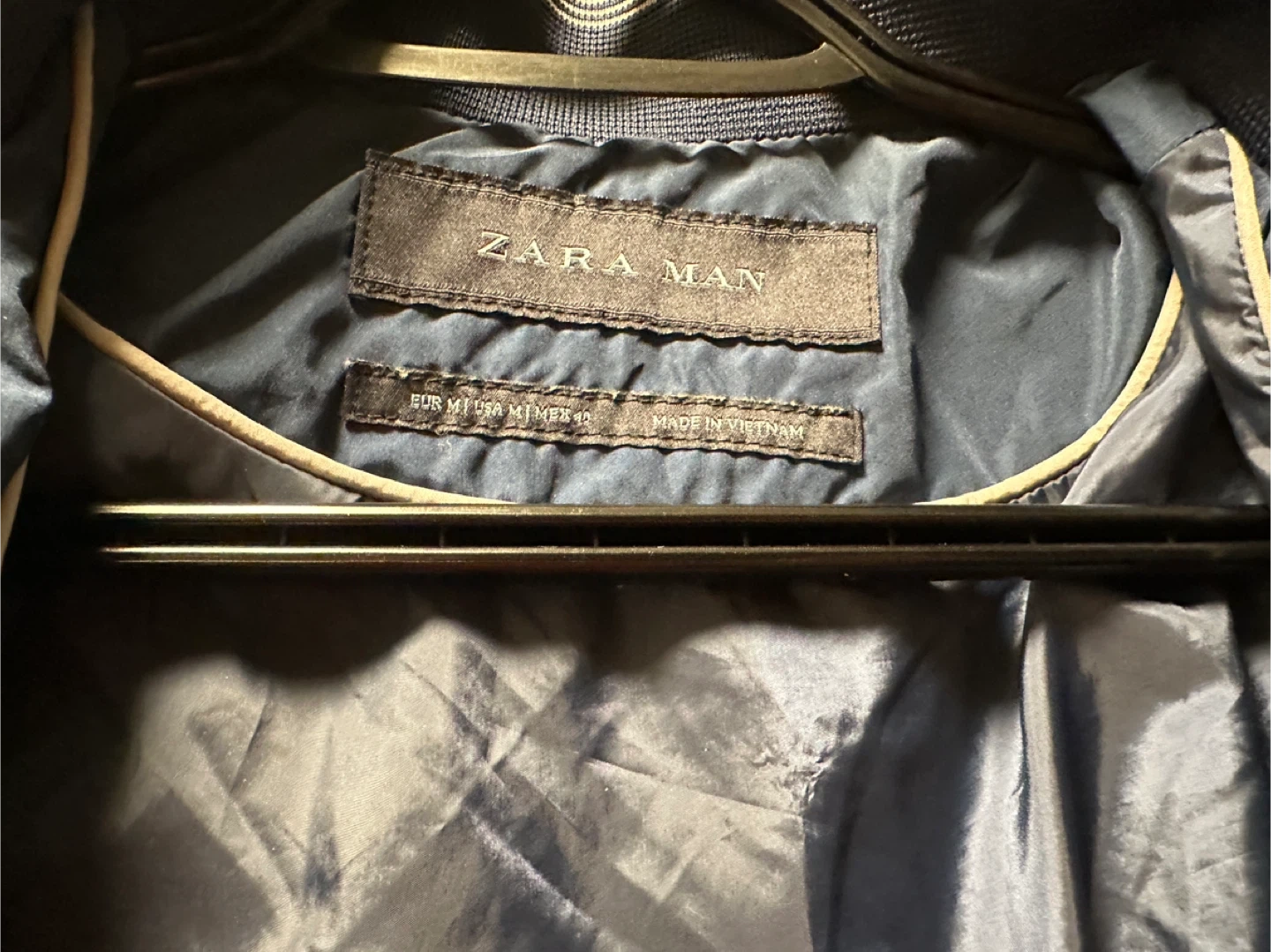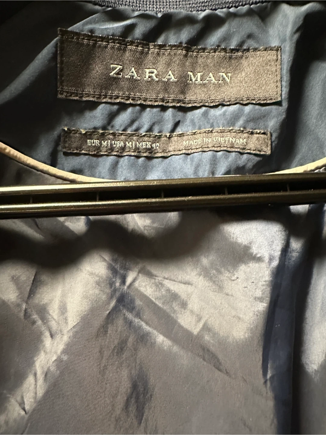 This is a navy blue hooded jacket from Zara Man. It's a size medium. The jacket is made in Vietnam. It has a zippered front and pockets.