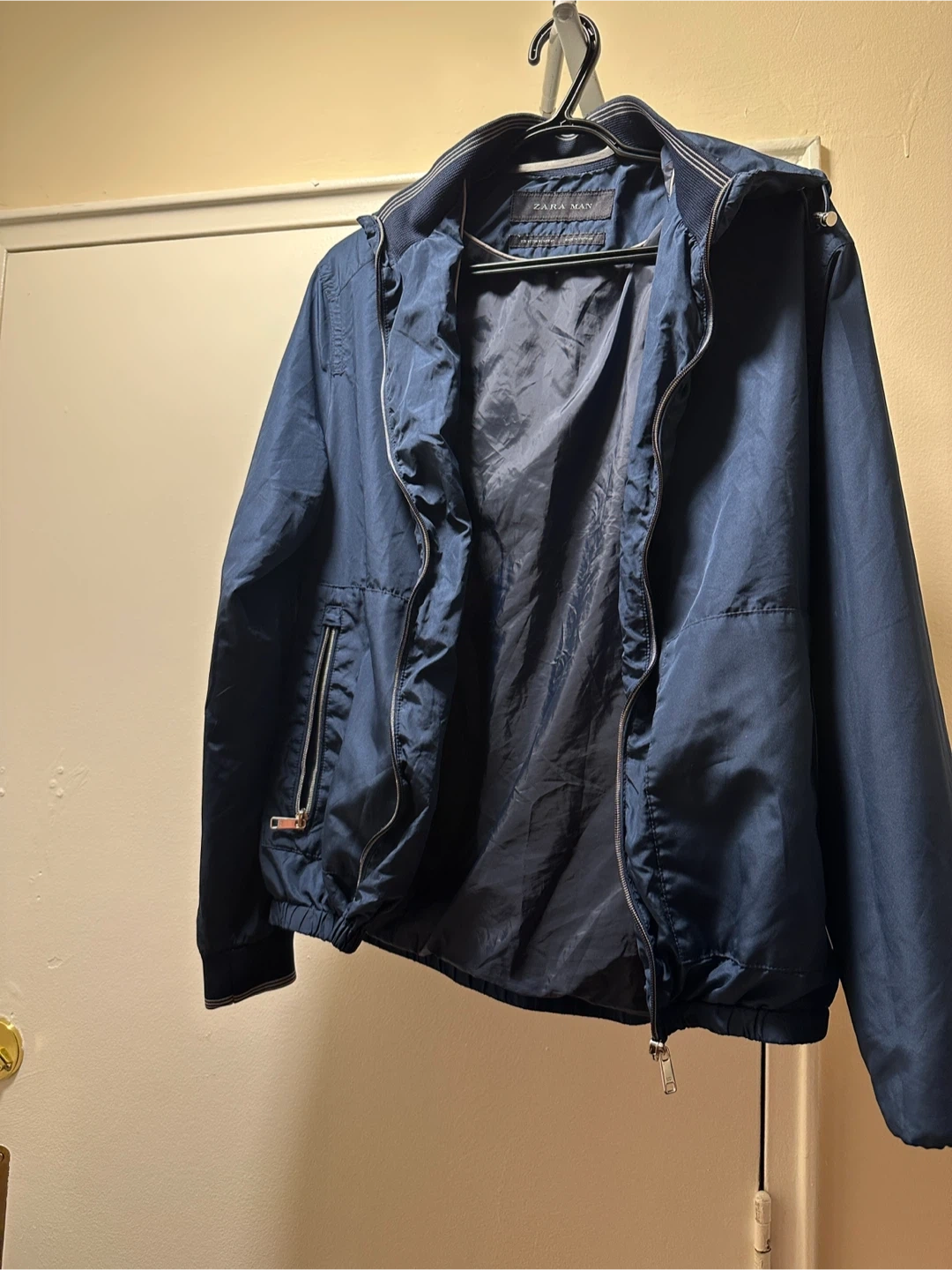 This is a navy blue hooded jacket from Zara Man. It's a size medium. The jacket is made in Vietnam. It has a zippered front and pockets.