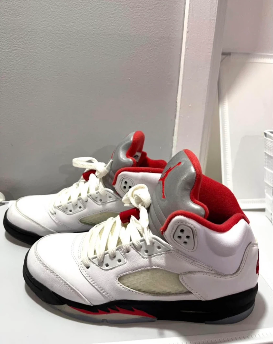 These are the Air Jordan 5 Retro sneakers in the 'Fire Red' colourway. They feature a white leather upper with red accents and a silver tongue. Nike Air branding is present on the heel.
