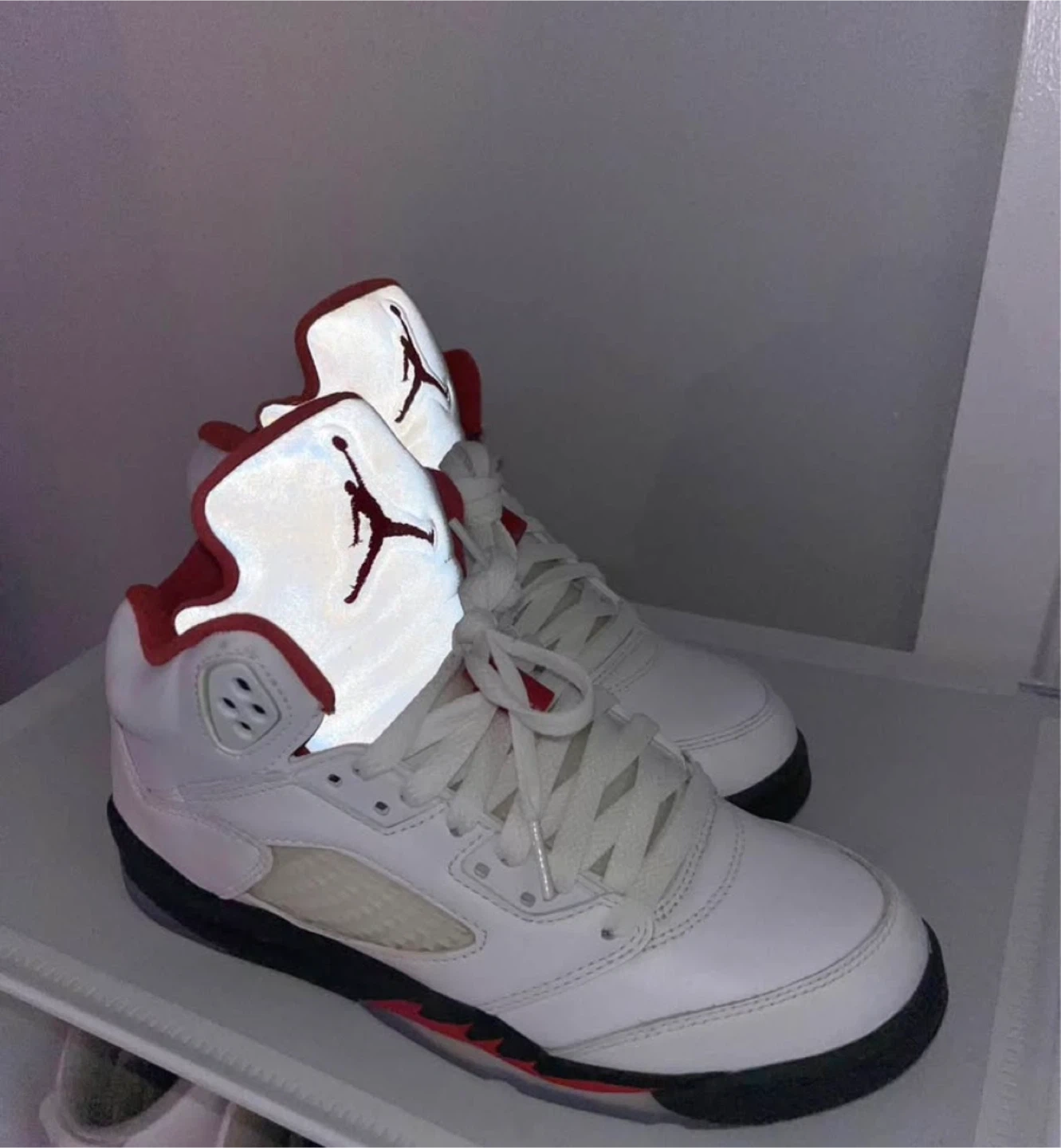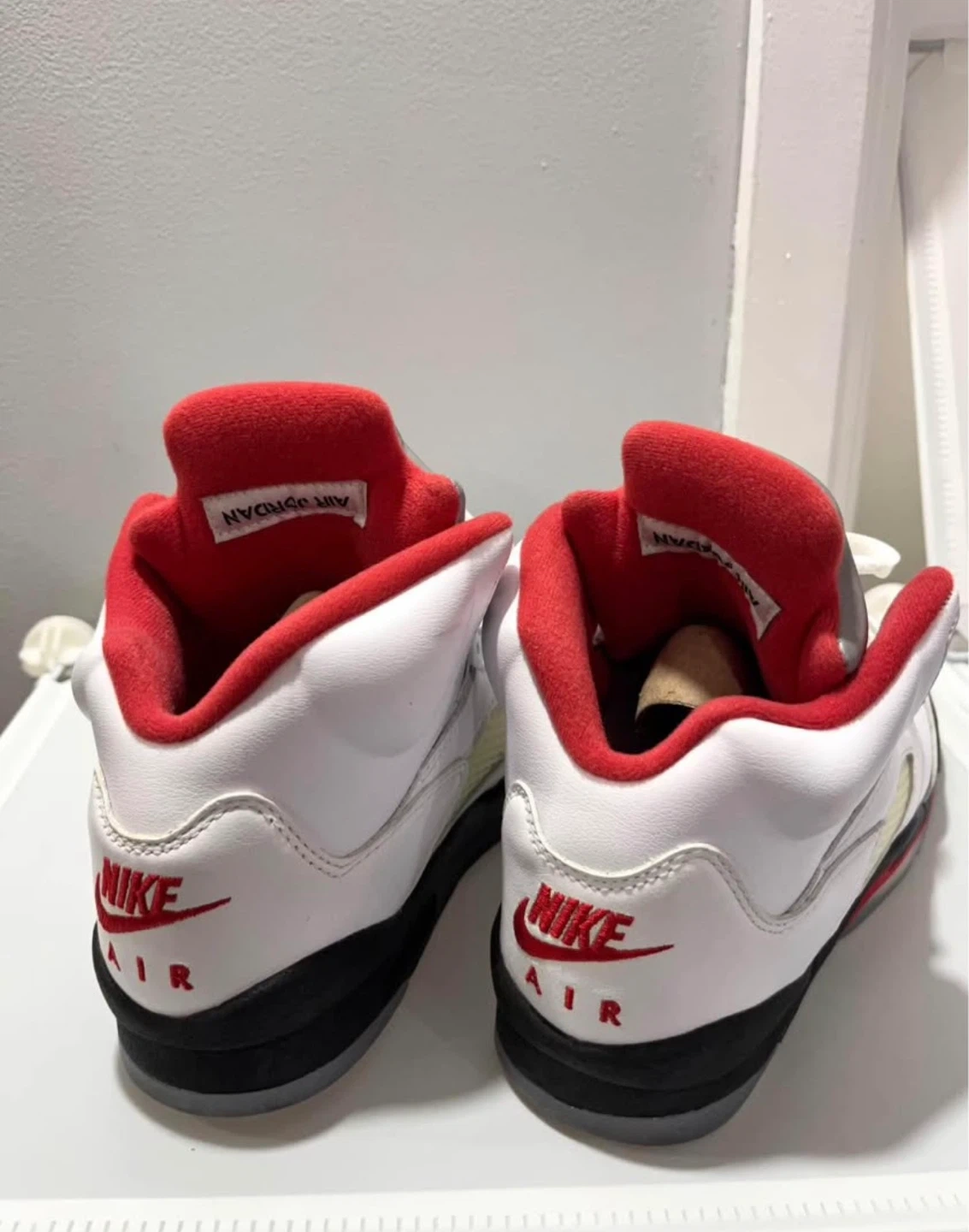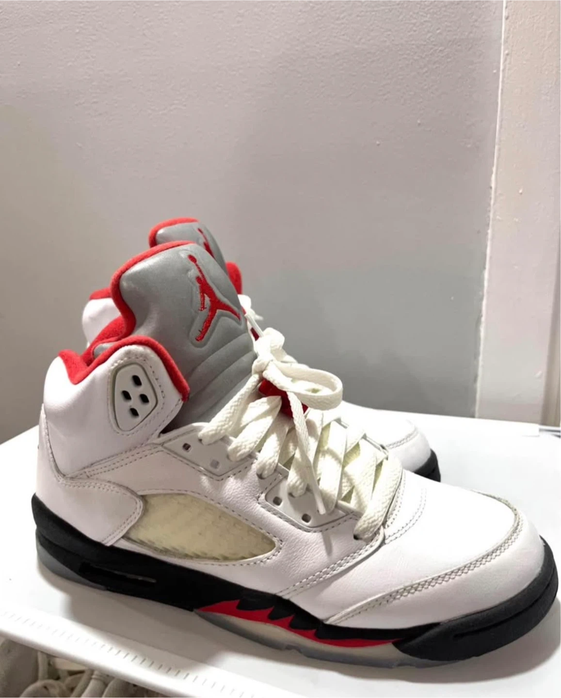 These are the Air Jordan 5 Retro sneakers in the 'Fire Red' colourway. They feature a white leather upper with red accents and a silver tongue. Nike Air branding is present on the heel.