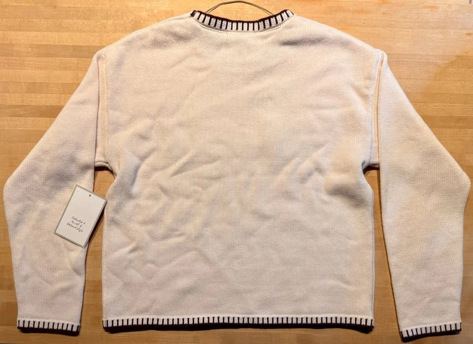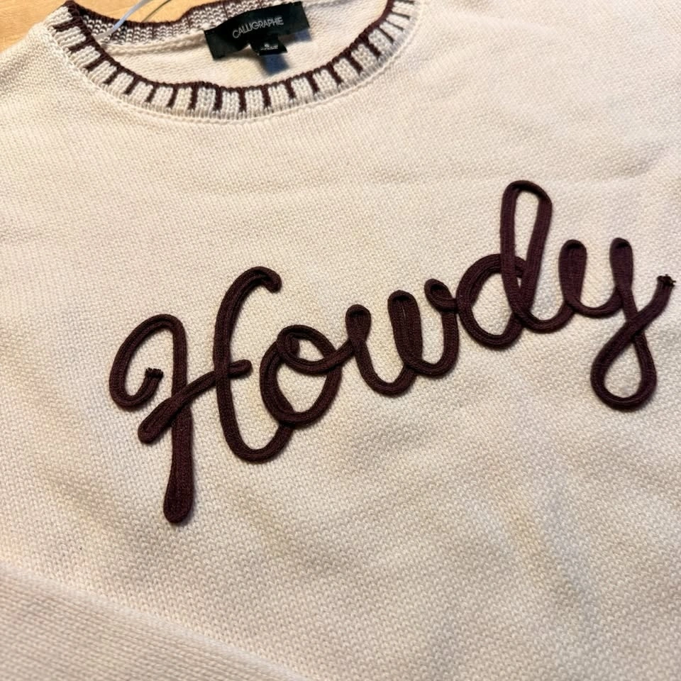 Brand new with tags. Cream knit with a raised "Howdy" script in deep burgundy, stitching at the collar, cuffs, and hem. Slightly cropped, relaxed fit. Soft knit (60% cotton / 40% acrylic) so it has structure but isn’t too heavy.