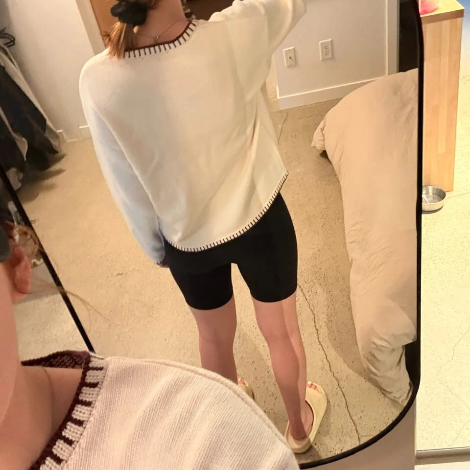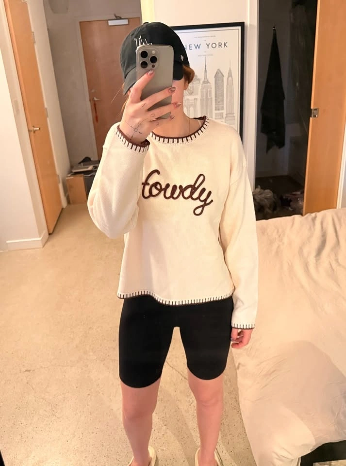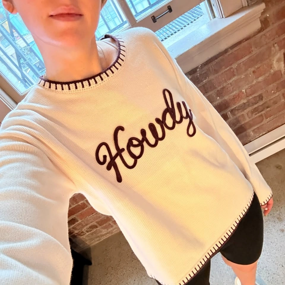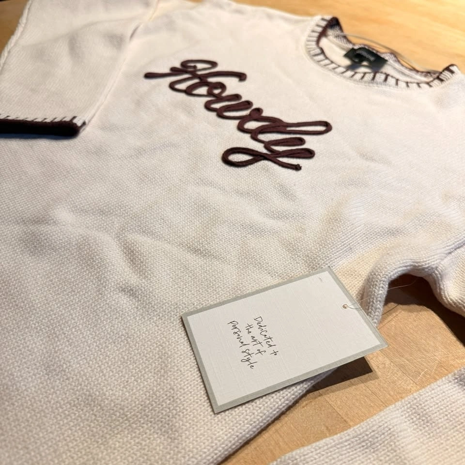 Brand new with tags. Cream knit with a raised "Howdy" script in deep burgundy, stitching at the collar, cuffs, and hem. Slightly cropped, relaxed fit. Soft knit (60% cotton / 40% acrylic) so it has structure but isn’t too heavy.