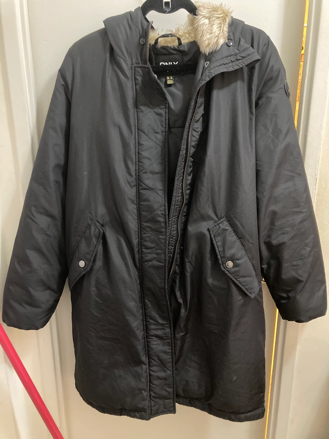 It’s a light puffer, perfect for the weather now. Hits at the knee if you are petite.