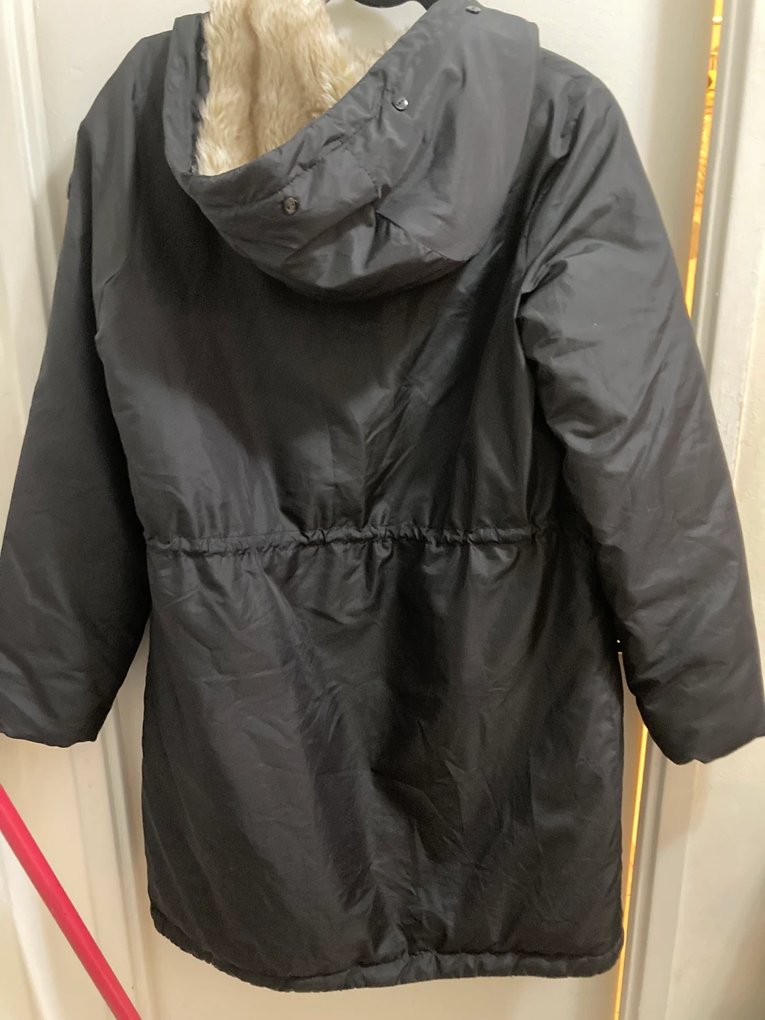 It’s a light puffer, perfect for the weather now. Hits at the knee if you are petite.