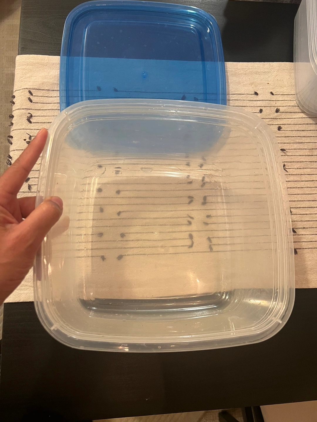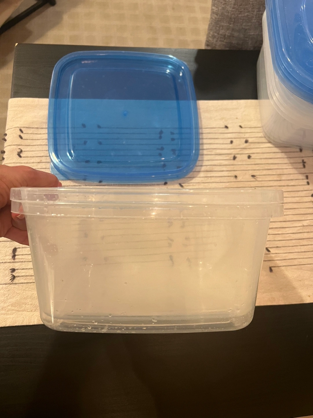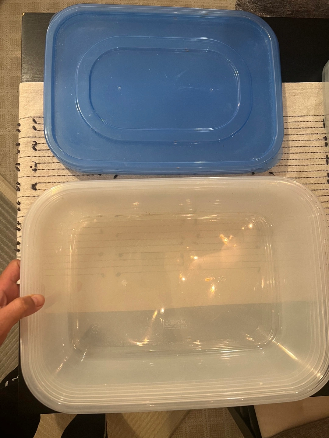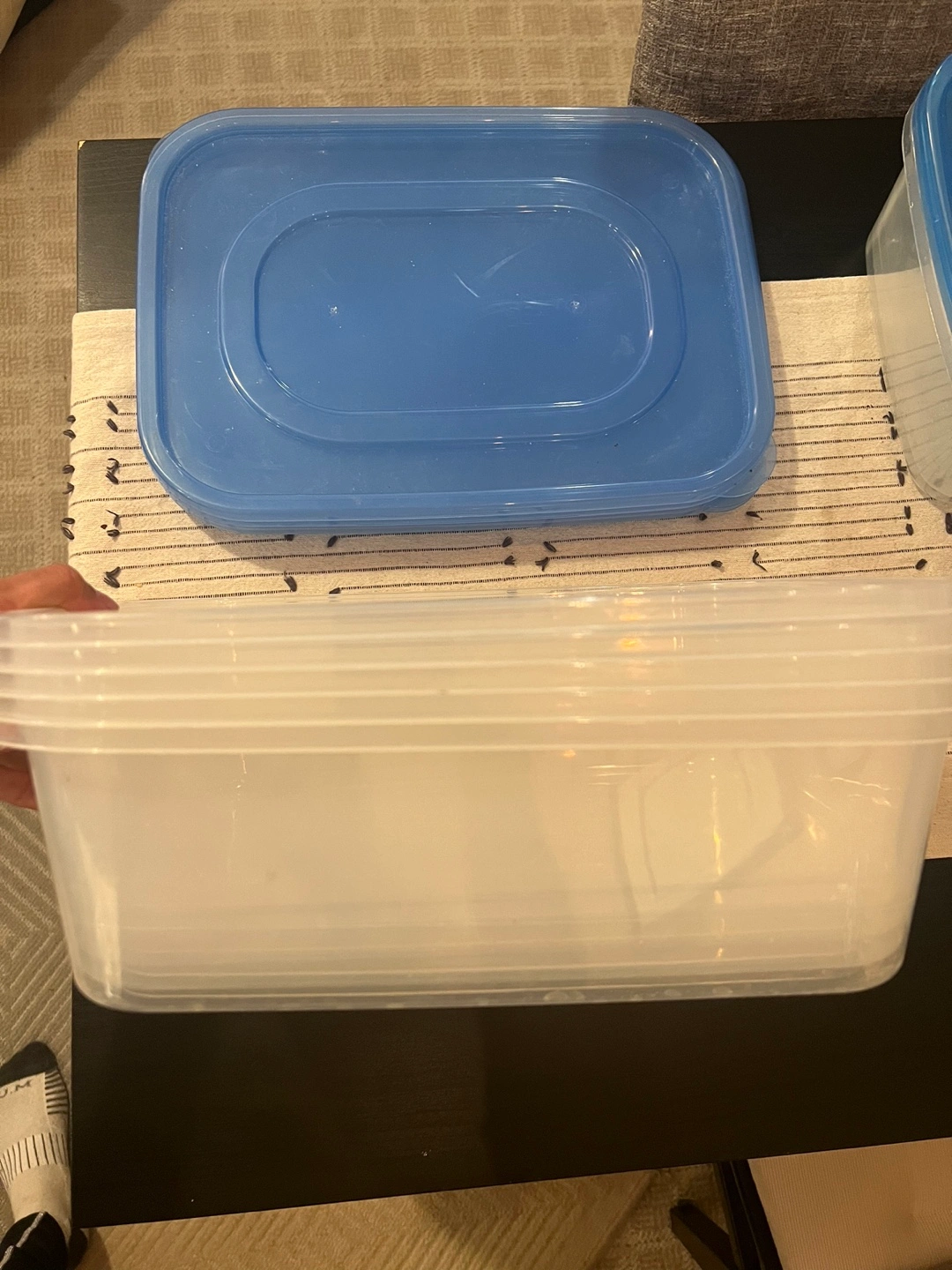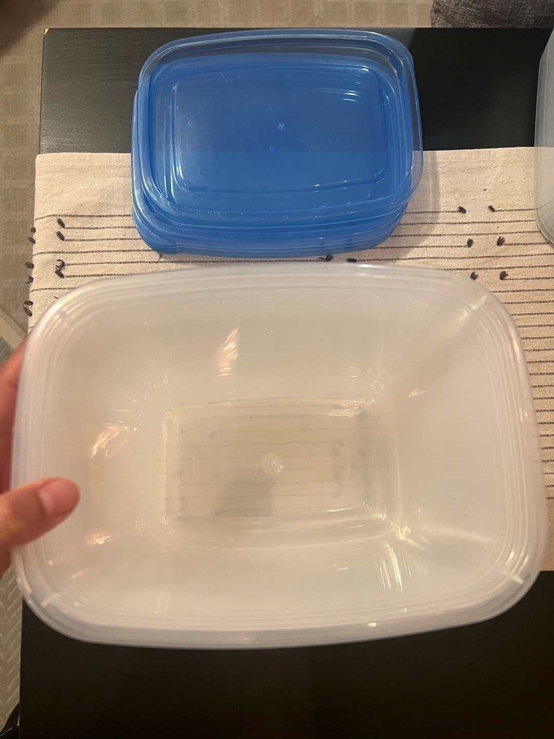Set of rectangular plastic food storage containers. Clear containers with blue lids. Great for organizing food or other items.