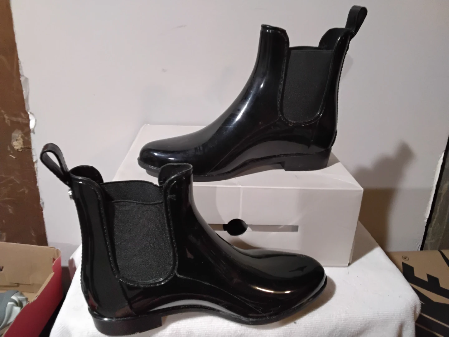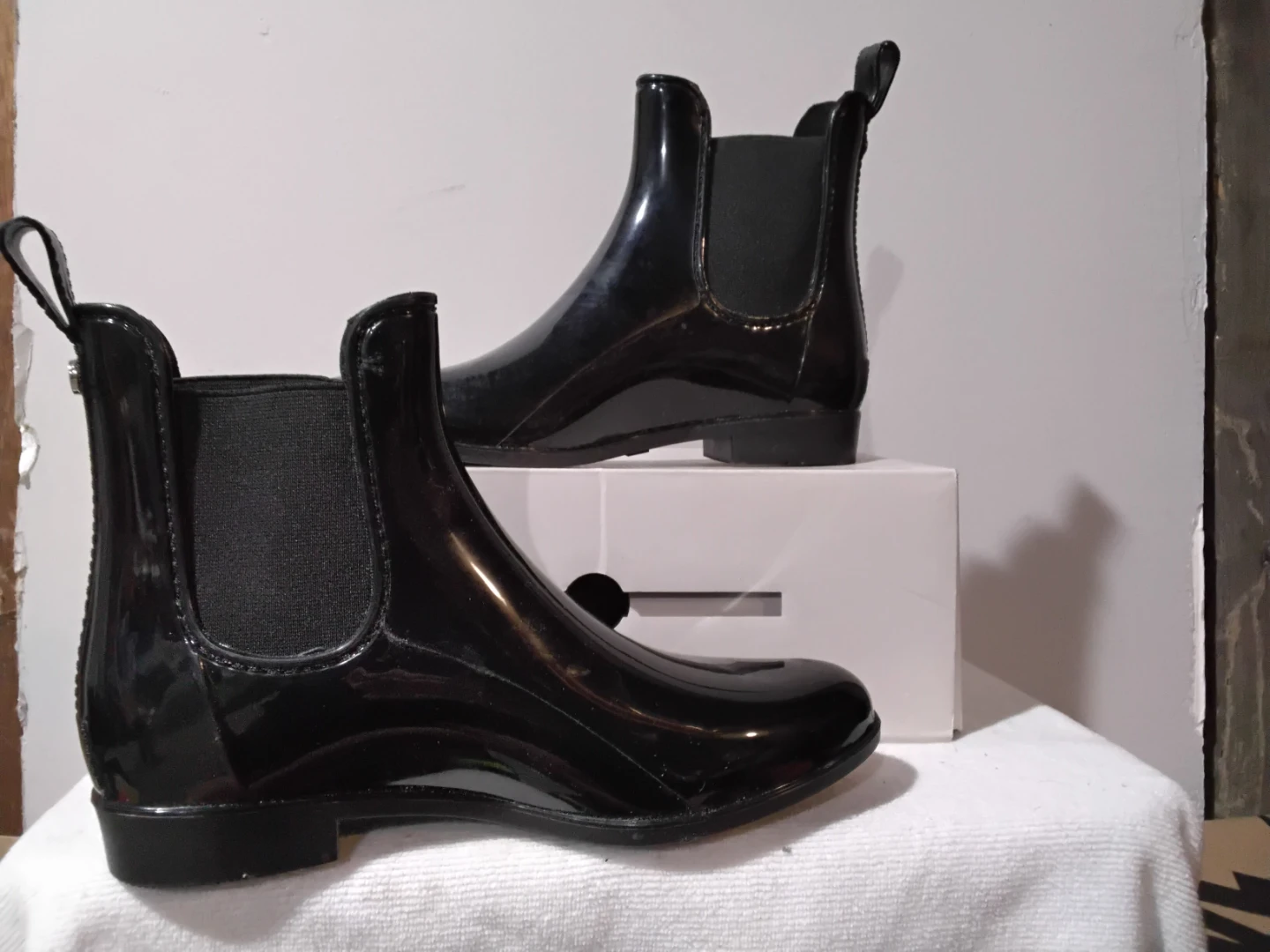 These are shiny black Chelsea style rain boots. They appear to be made of a waterproof material, perfect for wet weather. Elastic side panels make them easy to slip on and off. Mark Fisher