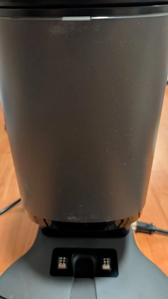 Minor cosmetic damage, but functions perfectly. It self-empties into a dust bag.