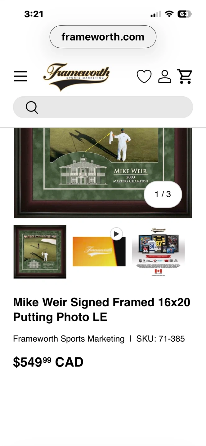 Brand New Limited Edition Mike Weir 2003 Masters Champion Signed Framed Photo 29X29”. This Limited edition dark wood framed piece was hand signed by Mike Weir. Comes with Certificate of authenticity. Ready to hang! Size of frame is 29” X 29". Smaller size retails for $550 + tax. Please see photos. Pick up Warden and highway 7 area in Markham. Serious buyers and cash only please.