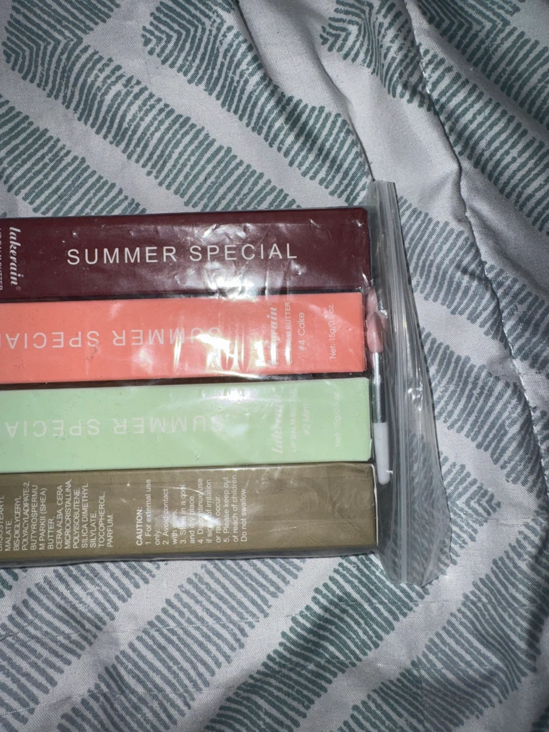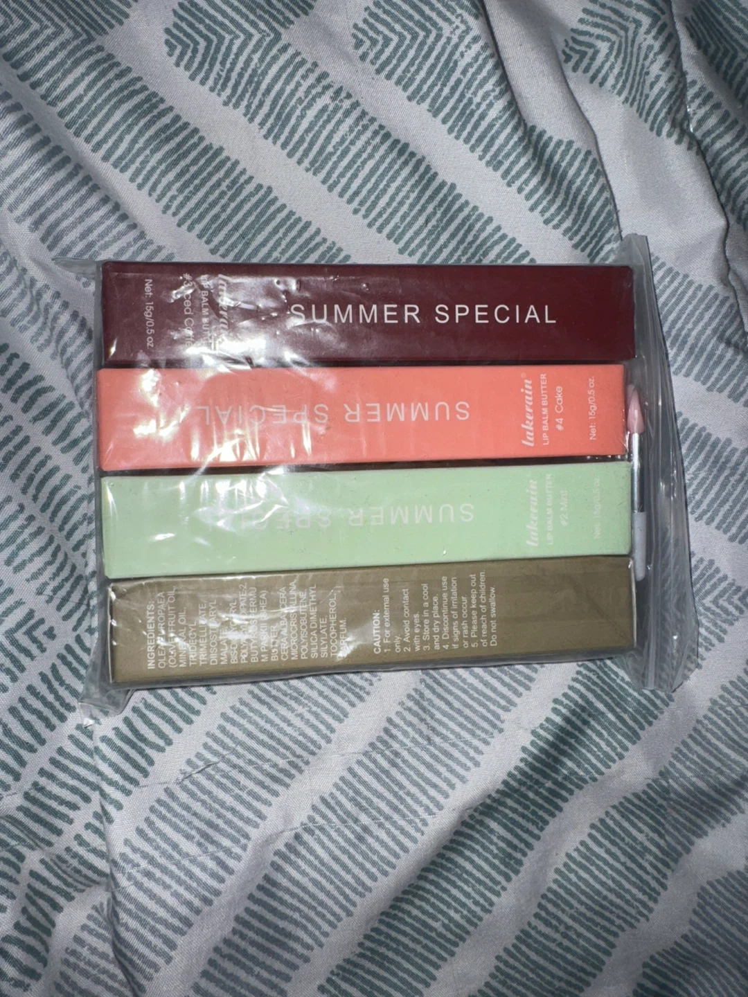 This is a set of four Lakerain Lip Balm Butters, labelled as a 'Summer Special'. It includes shades #4 Cove and #2 Macaroon. Each balm is 10g/0.35 oz. These are suitable for anyone looking for lip care.
