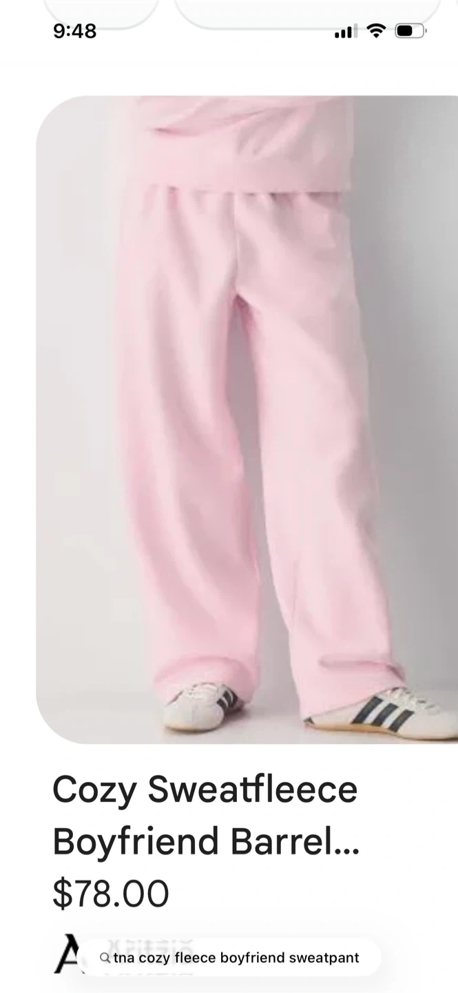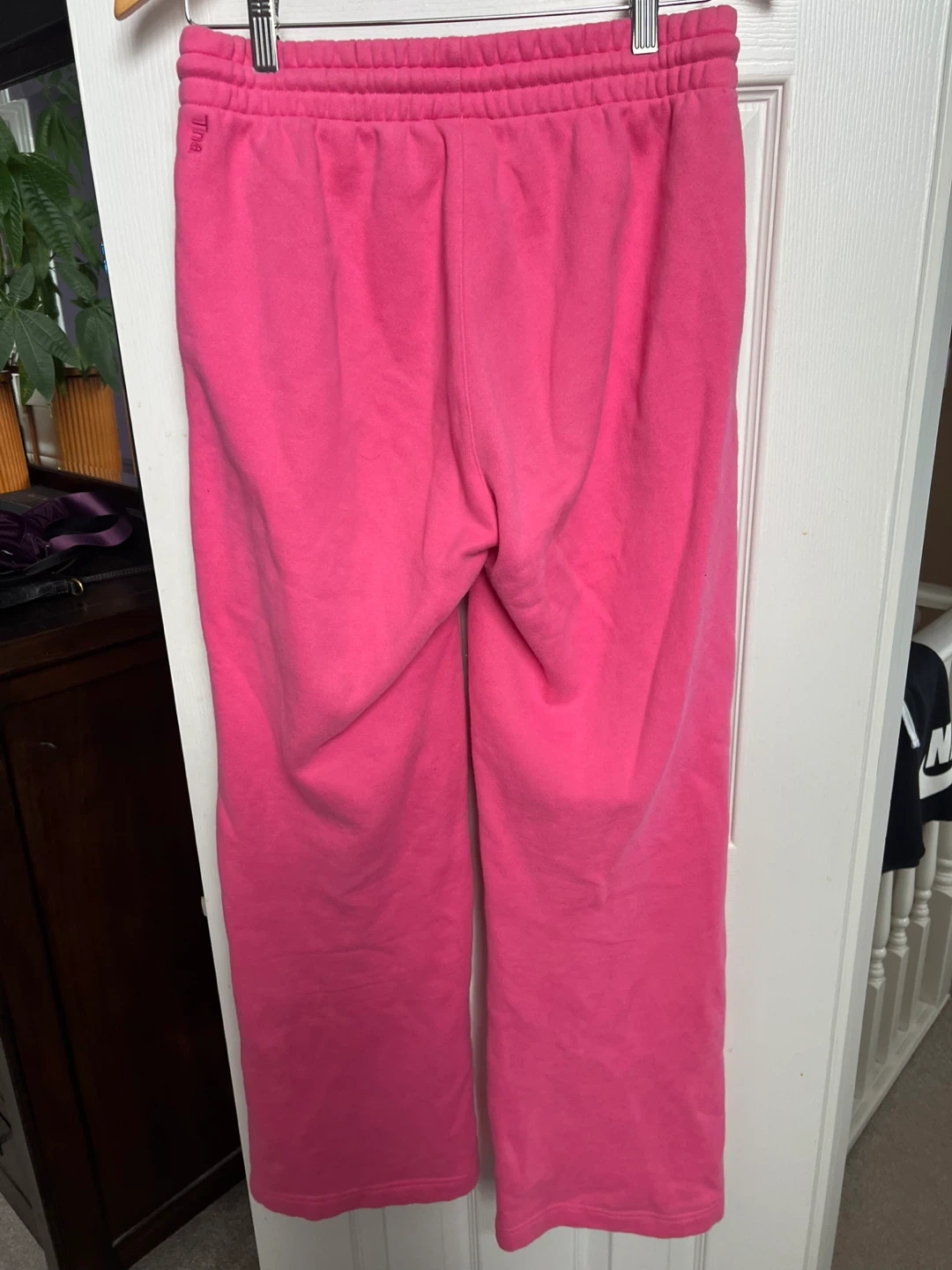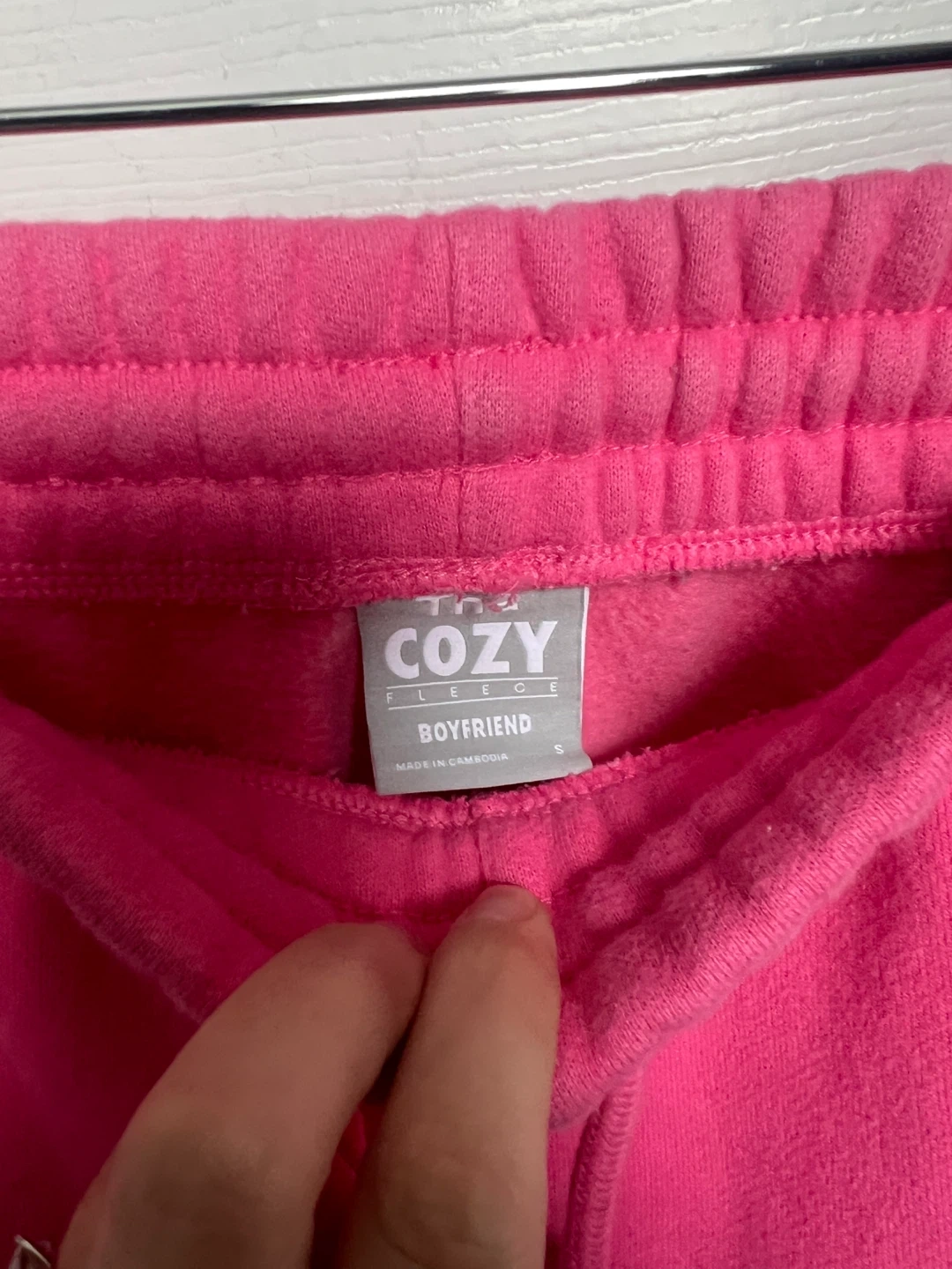 These are bright pink Tna sweatpants. They're a size small and made from cozy fleece material. They have an elastic waistband with a drawstring and a relaxed boyfriend fit.