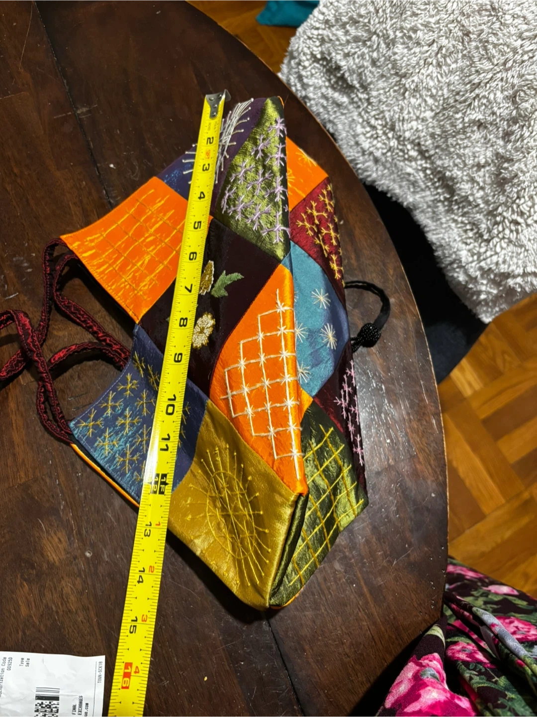 Quirky and colorful patchwork shoulder bag. Features intricate embroidery on various fabric panels. Bag is about 14 inches tall and 12 inches wide at its widest point. The straps are braided red cord.
