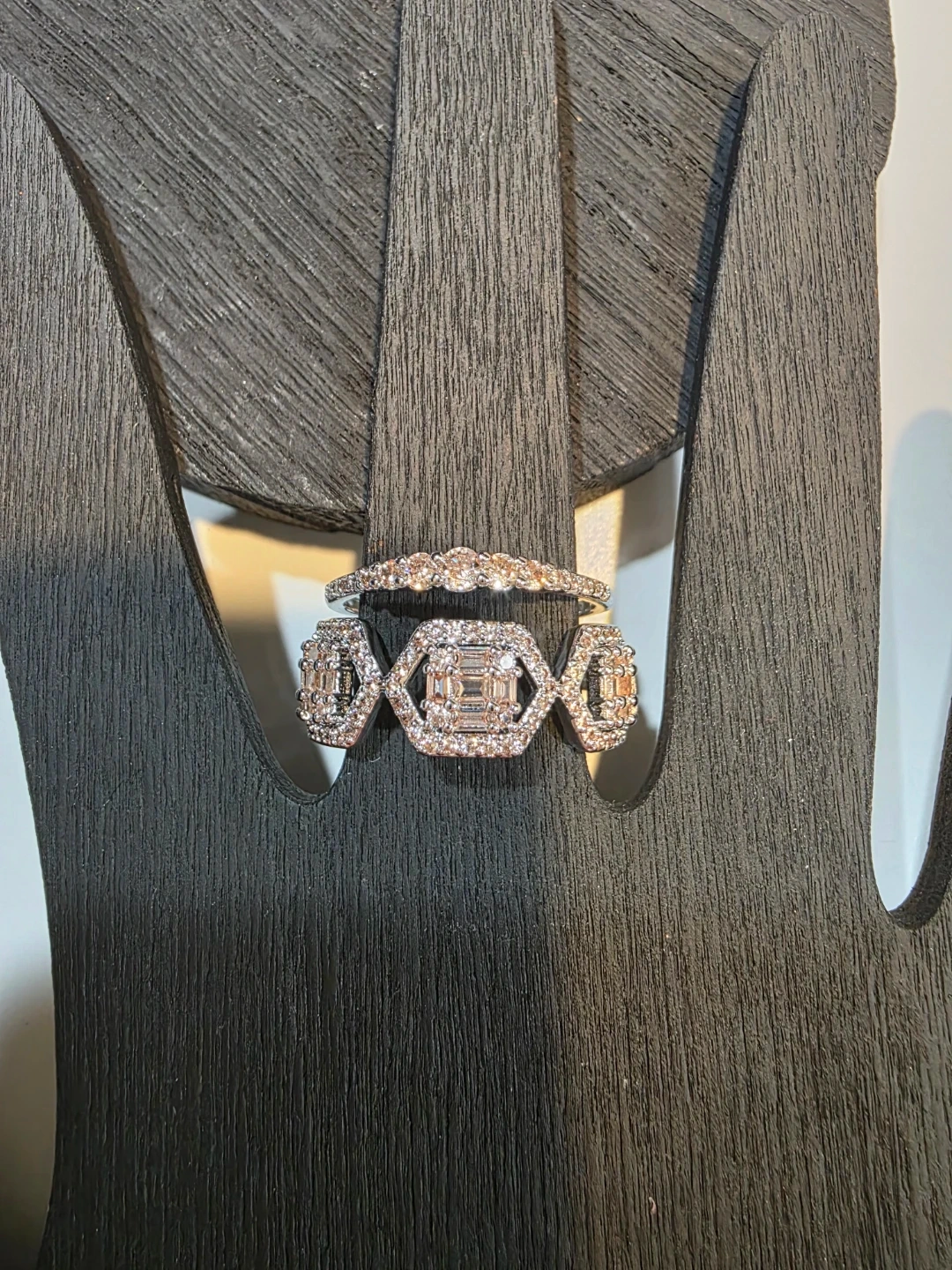 Set of two Smokey and dark Smokey Topaz cubic zirconia rings. One band features a line of small stones, and the other has a geometric design with a center emerald-cut stone surrounded by smaller stones. Beautiful rings that can be worn separately. Non tarnish rhodium Plating.