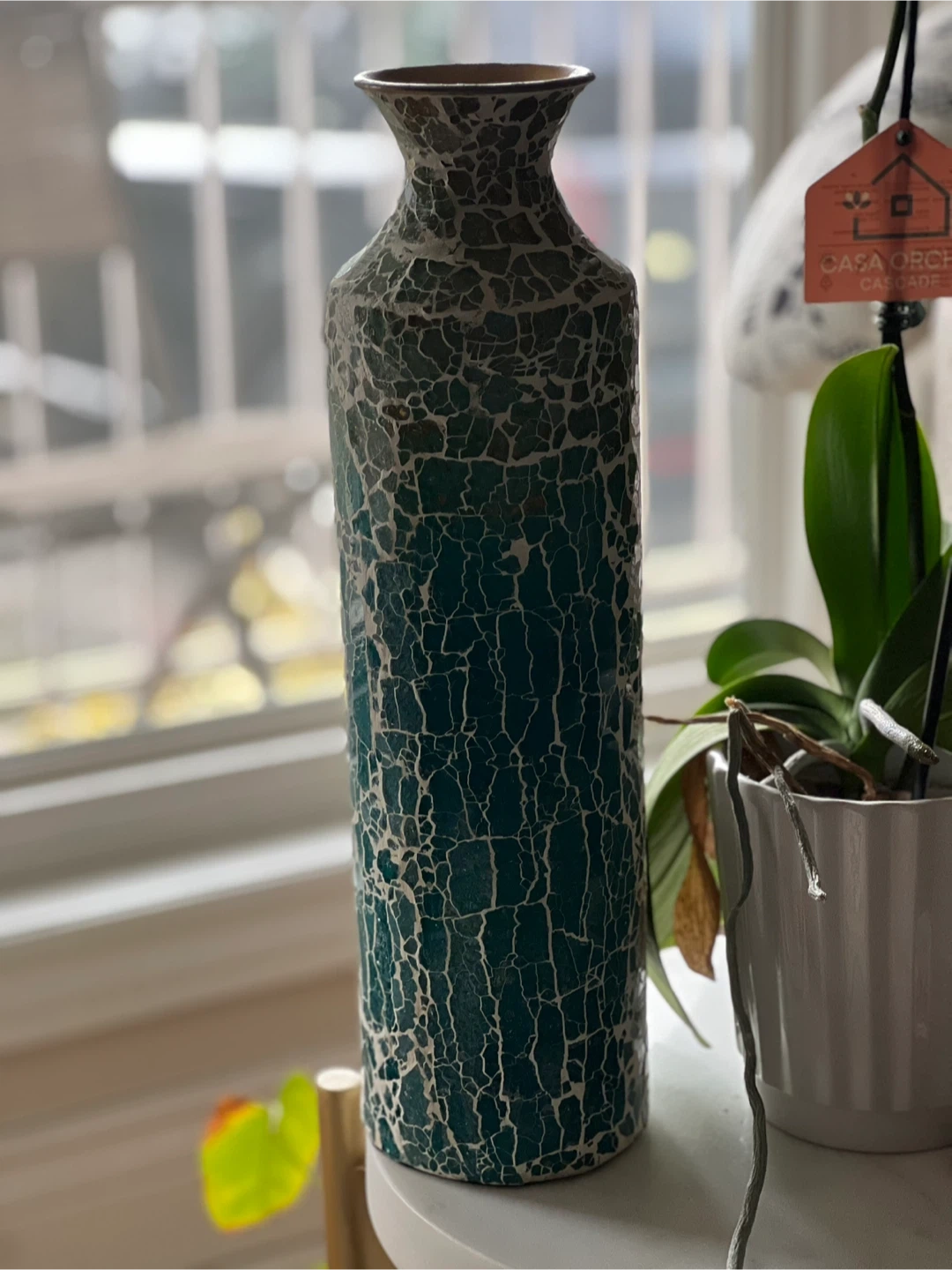 Tall vase with a teal and white crackle mosaic finish. It's approximately 15 inches tall. This decorative piece adds a touch of style to any room. It's suitable for displaying flowers or as a standalone decor item.