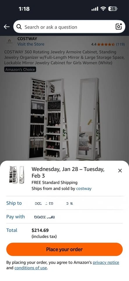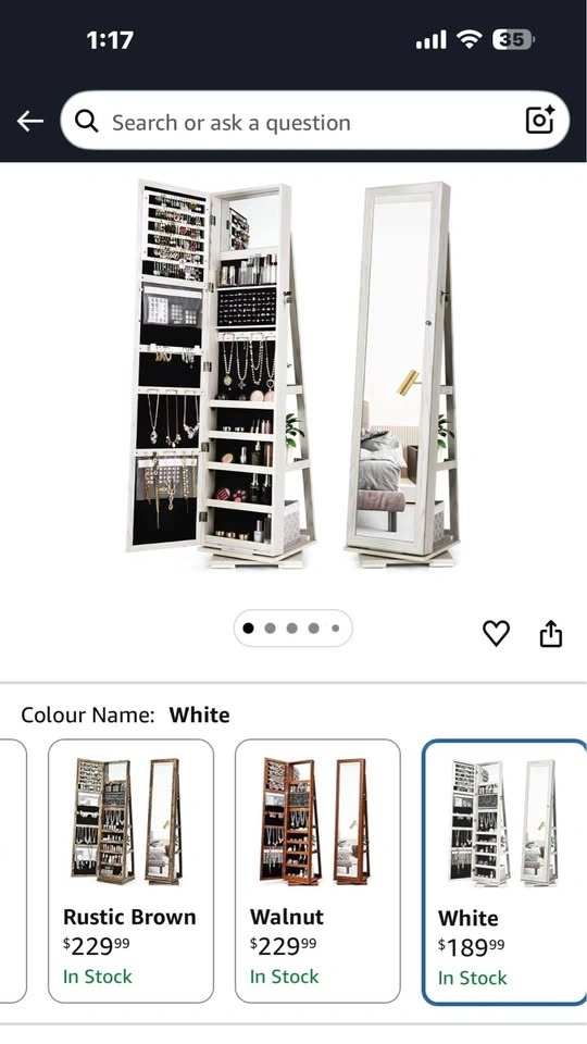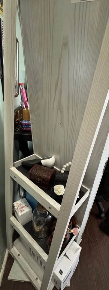 White full-length mirror jewelry cabinet in very good condition. This listing is for the mirror cabinet only — jewelry, makeup, and accessories are NOT included. Features: Full-size mirror, Hidden storage behind the mirror, Necklace hooks, earring slots & ring holders, Shelves and compartments for storage, Wall-mount or door-mount design, Strong wooden frame with smooth opening door. Great for organizing jewelry while saving space in your room. Selling because I don’t need it anymore.