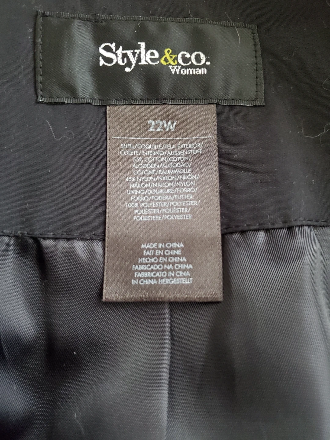 A black trench coat from Style & Co. Woman. It's a size 22W. The shell is a blend of 55% cotton and 45% nylon. The lining is 100% polyester. This coat is suitable for transitional weather.
