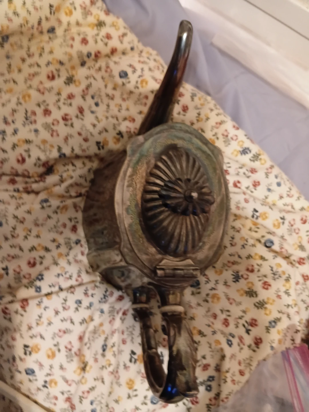This is a decorative metal teapot with intricate etched detailing. It features an ornate handle and spout, common in vintage serving pieces. It's a lovely accent for a tea service or display cabinet.
