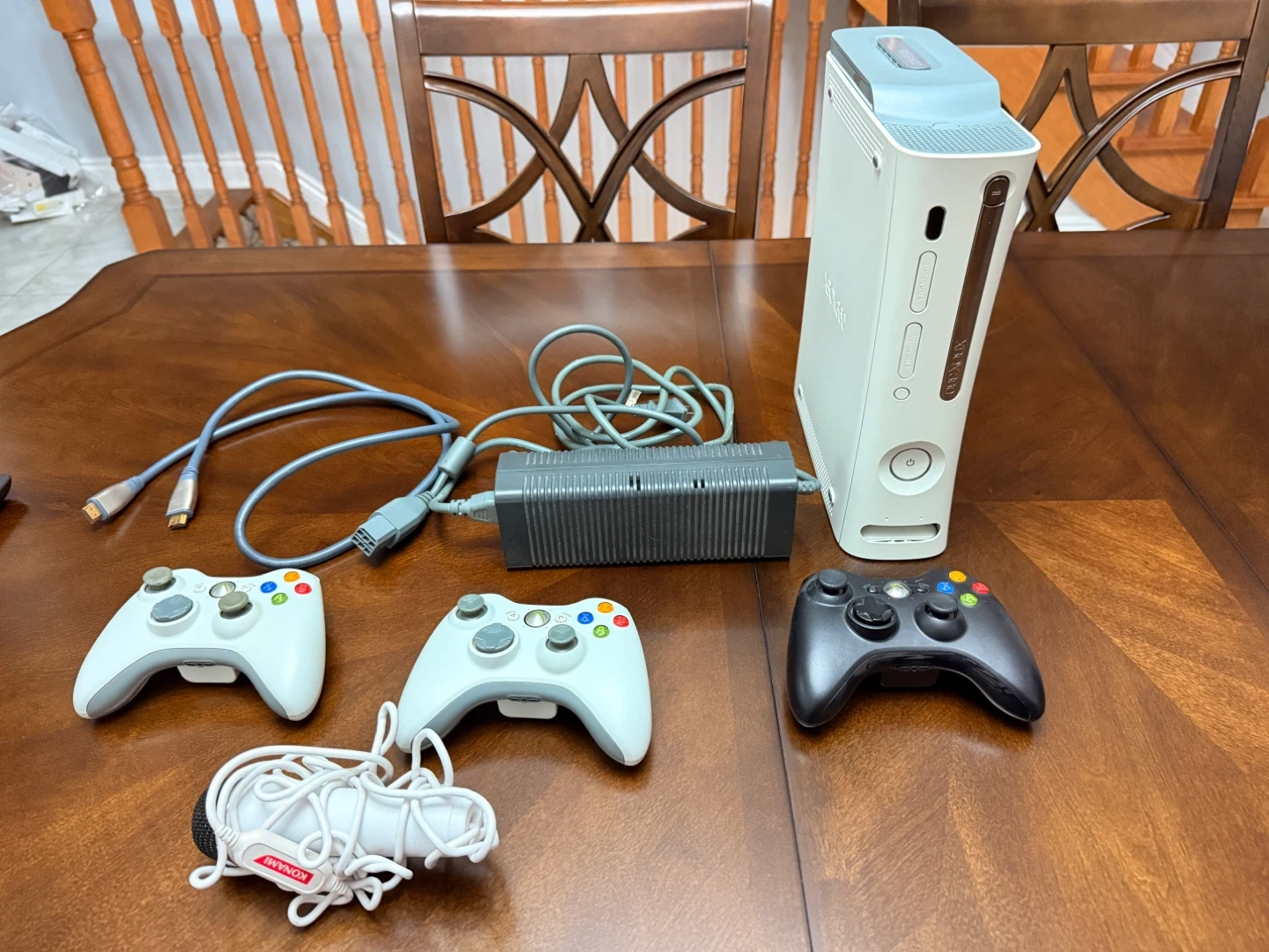 15Selling my Xbox 360! It comes with the console, power adapter, and three controllers (two white, one black). Also included is a Konami microphone and an HDMI cable. Ready for some classic gaming!