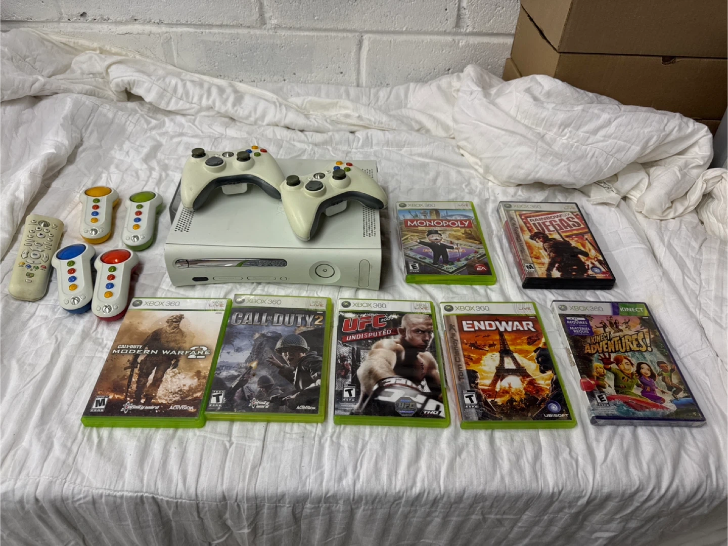 60Selling an Xbox 360 console with two controllers and some games. Includes the console, two white controllers, and a few games like Monopoly, Rainbow Six Vegas, Call of Duty Modern Warfare 2, UFC Undisputed 2009, Endwar, and Kinect Adventures! Also includes some additional accessories.