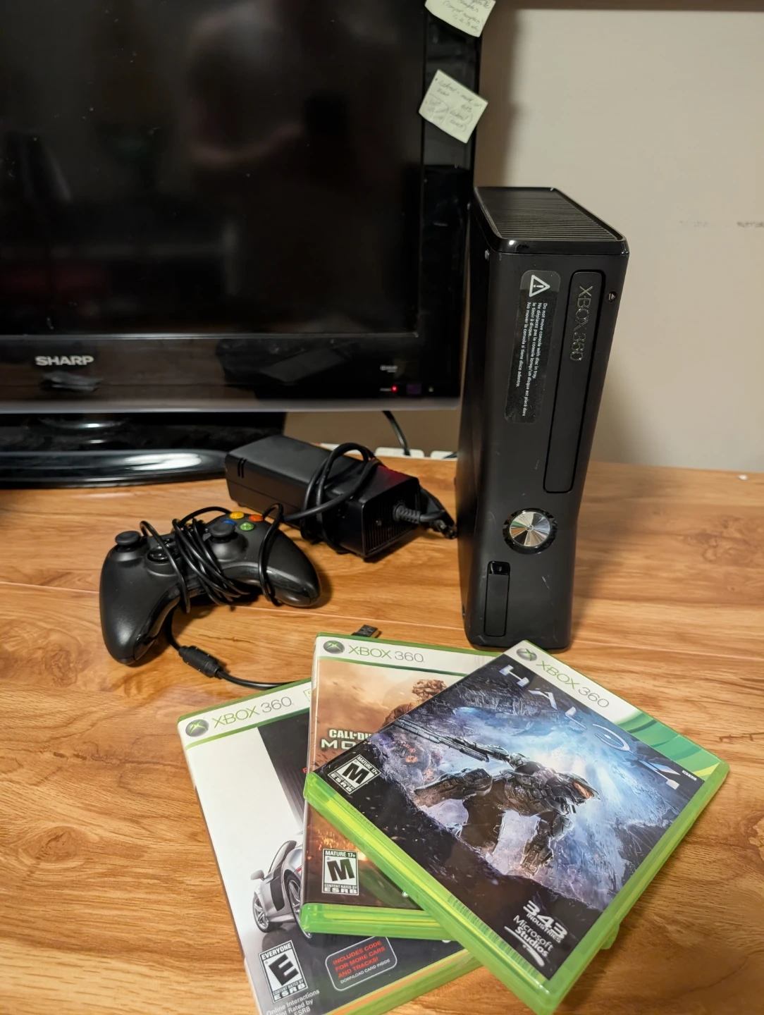 12Selling an Xbox 360 console in good condition! Includes a controller, power adapter, and three games: Forza Motorsport 3, Call of Duty: Modern Warfare 2, and Halo 4