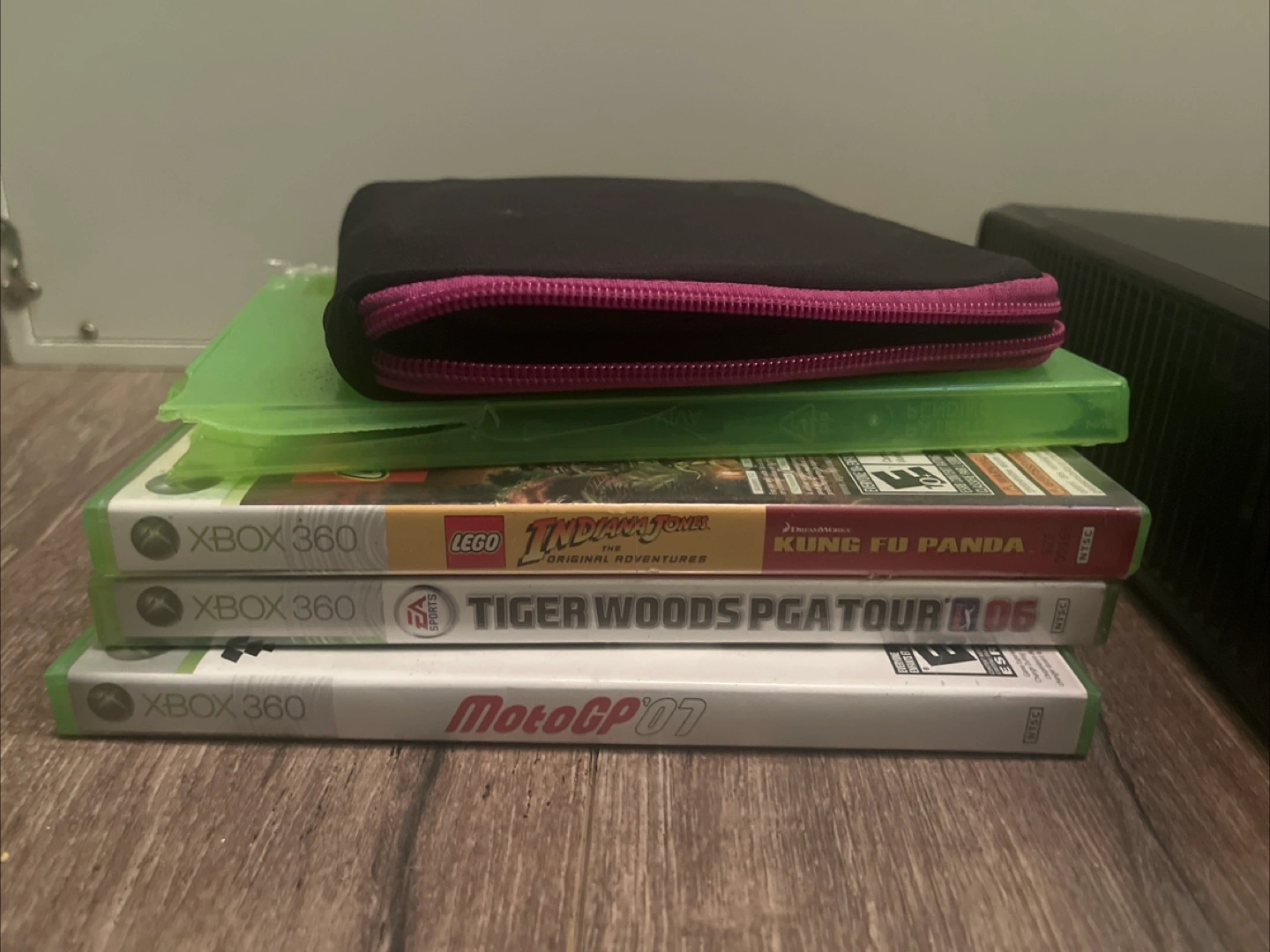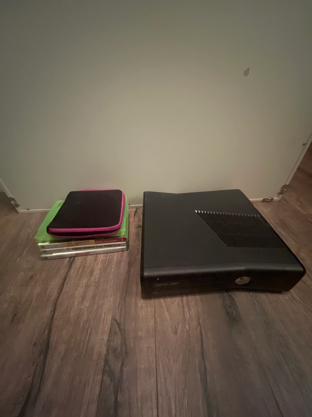 Xbox, games, Kinect motion Camera, controllers. Comes with the needed wires. It works beautifully, I just don’t use it. CD’s: LEGO, Indiana Jones. Resident Evil Revelations. Bioshock Infinite. Kungfu Panda. Cars 2. EA sports, Tiger woods PGA tour. MotoGP’07. PGR4. Metal Gear Solid, Disk 1 and Disk 2. Portal 2. Need for Speed, Hot pursuit. Pirates of the Caribbean. Kinect Adventures! Dance Centrql 2. Grand Theft Auto, Liberty City. Dance Masters. Disneyland Adventures. Deca Sports, Freedom. Bejewled 3.