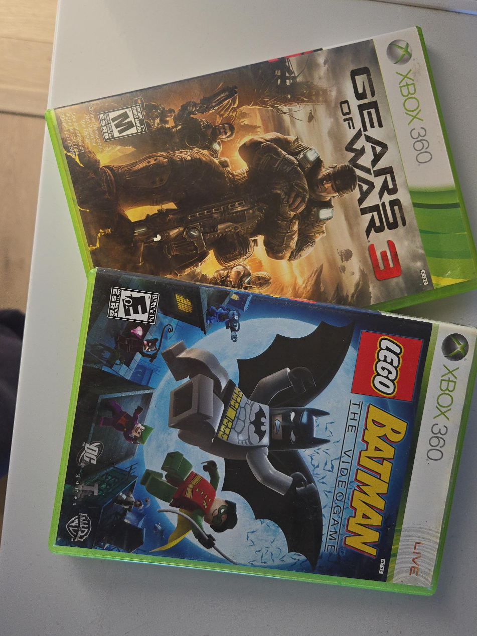 Selling two games for the Xbox 360. Included are Gears of War 3 (rated M) and Lego Batman: The Videogame (rated E10+)