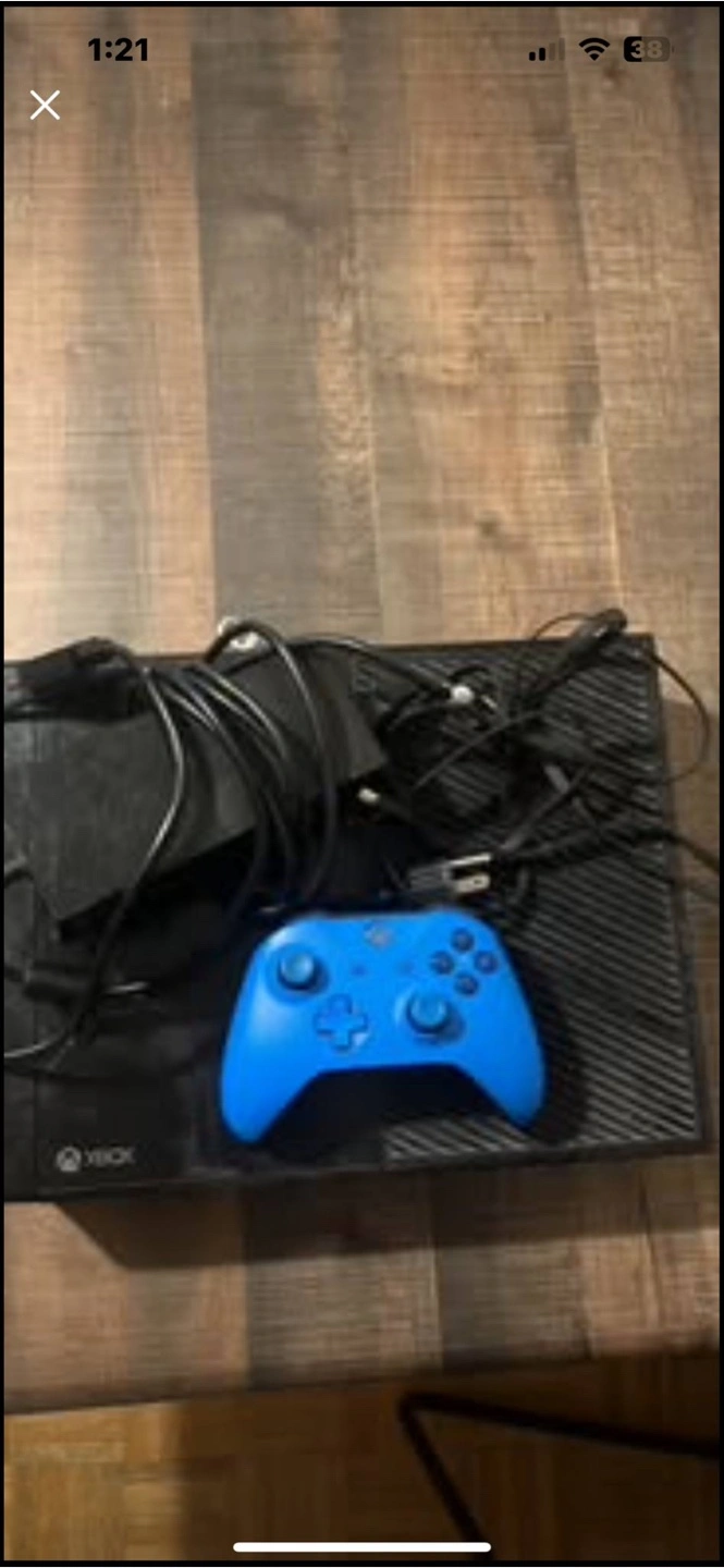 Xbox One console, blue controller, and various cables included. Pre-owned. (Negotiable) (Will trade for a iPad and stylist pencil)