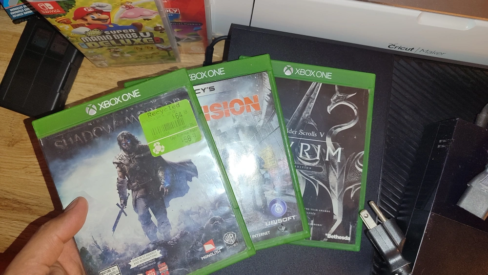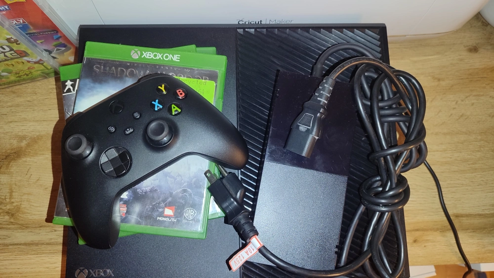 Selling an Xbox One console in good condition. Includes the power cable and a controller. Also comes with three games: Shadow of Mordor, The Division, and Skyrim.