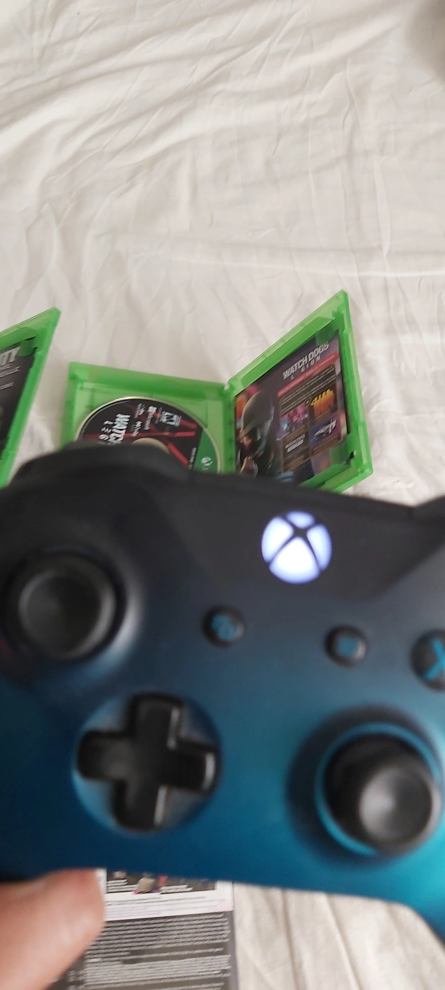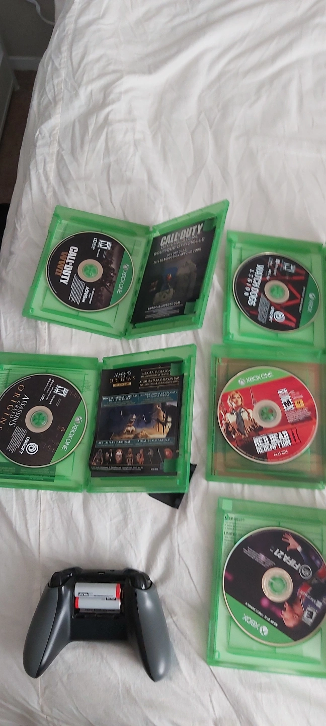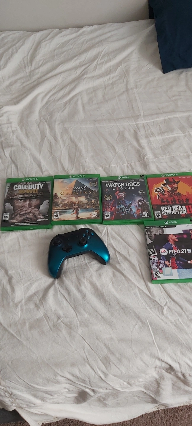 10Five Xbox One games: Call of Duty WWII, Call of Duty Black Ops 4, Assassin's Creed Origins, Watch Dogs Legion, Red Dead Redemption 2, and FIFA 21. Includes a teal Xbox One controller. Pre-owned.