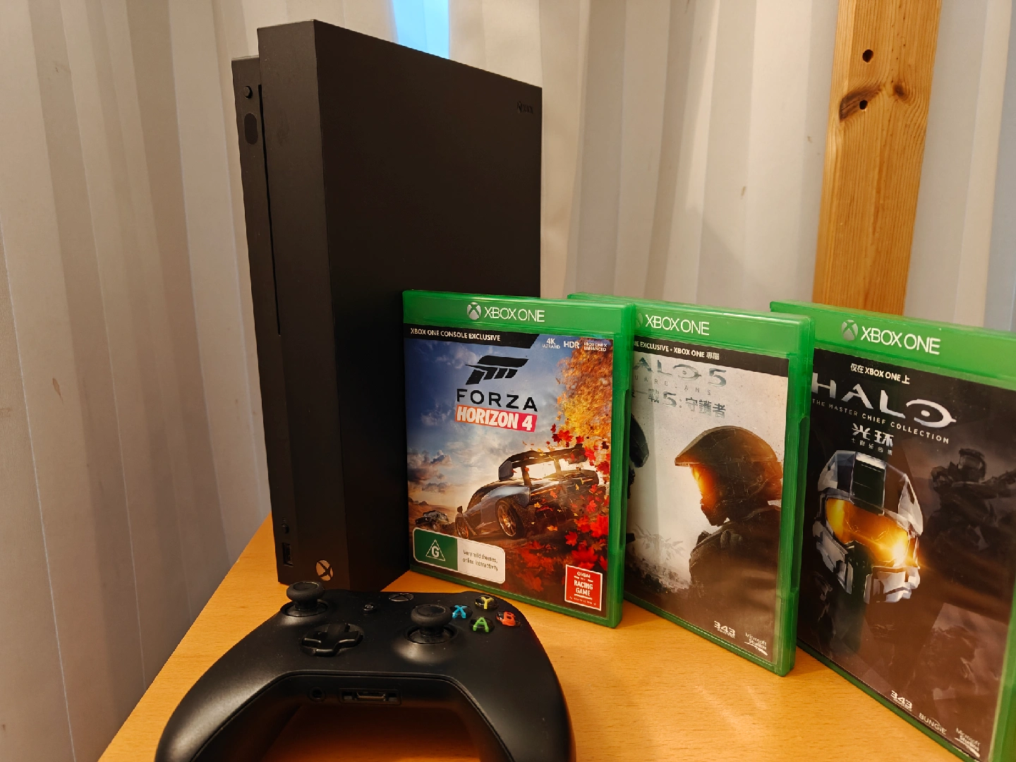 80Selling an Xbox One X console along with a controller and a few games! Includes Forza Horizon 4, Halo 5 Guardians, and Halo: The Master Chief Collection. Great for some fun gaming nights! Come with power cord, HTMI cord and it's the 1TB version