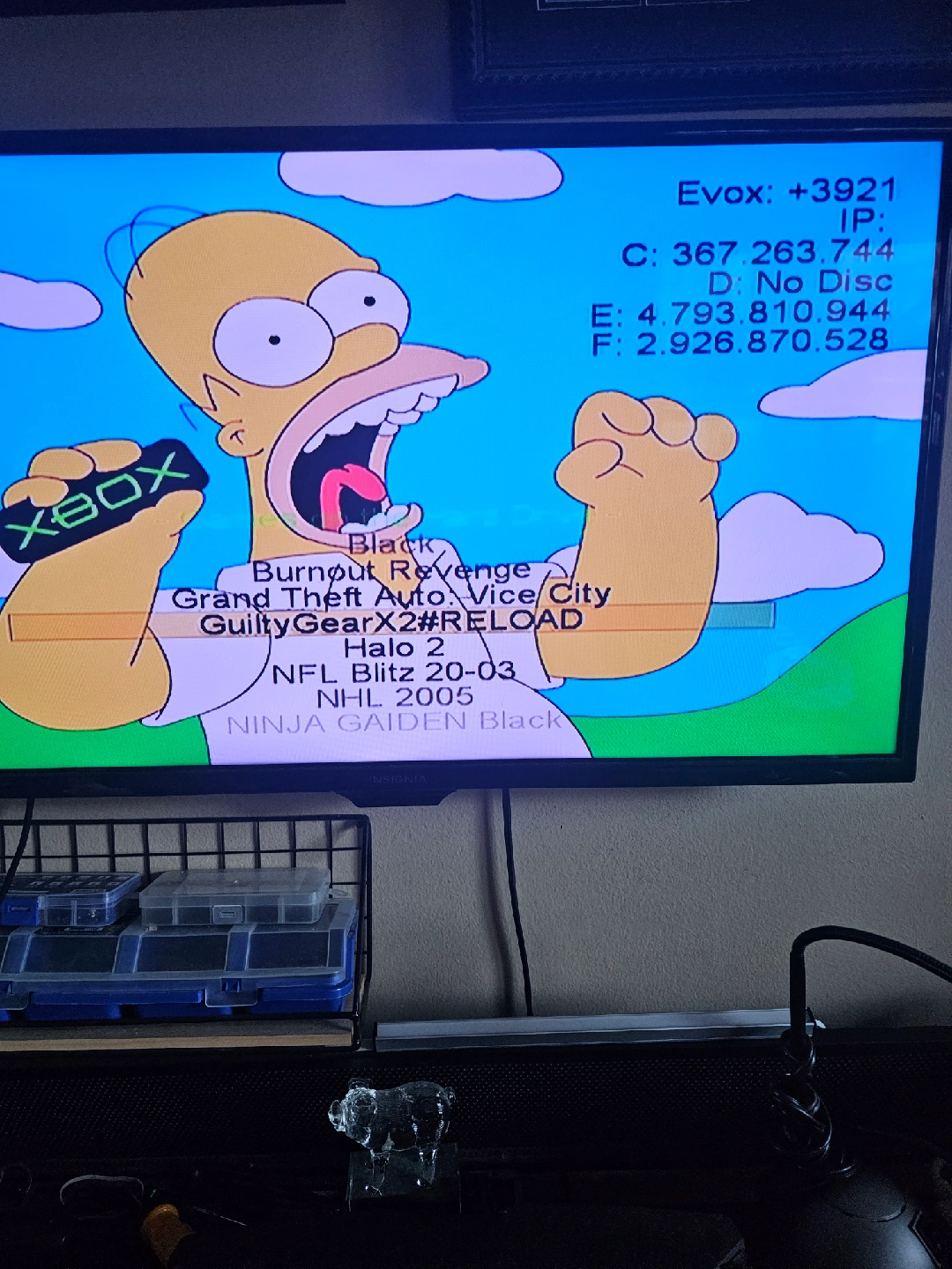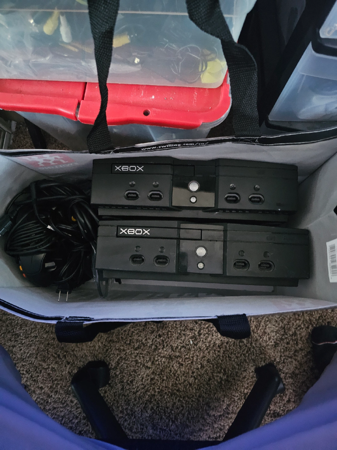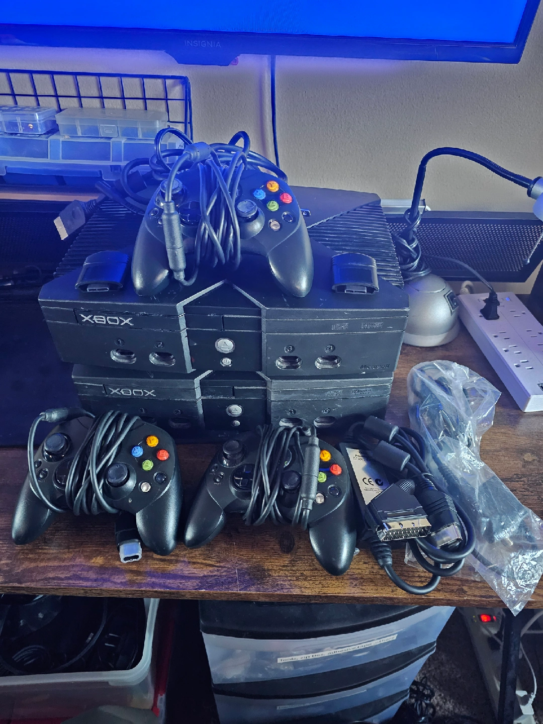 Xbox Original Bundle that has been modded!!! Xbox has everything you need to play games or download free games into it, also plays Disc games as well Comes with -Original Xbox Console -Original Power Cable -Original AV Cables -Original New Serial Cord -Original New Coax Cord -3 Original Controllers -2 Original Memory Cards -1 extra Xbox for parts it works just has optical issue