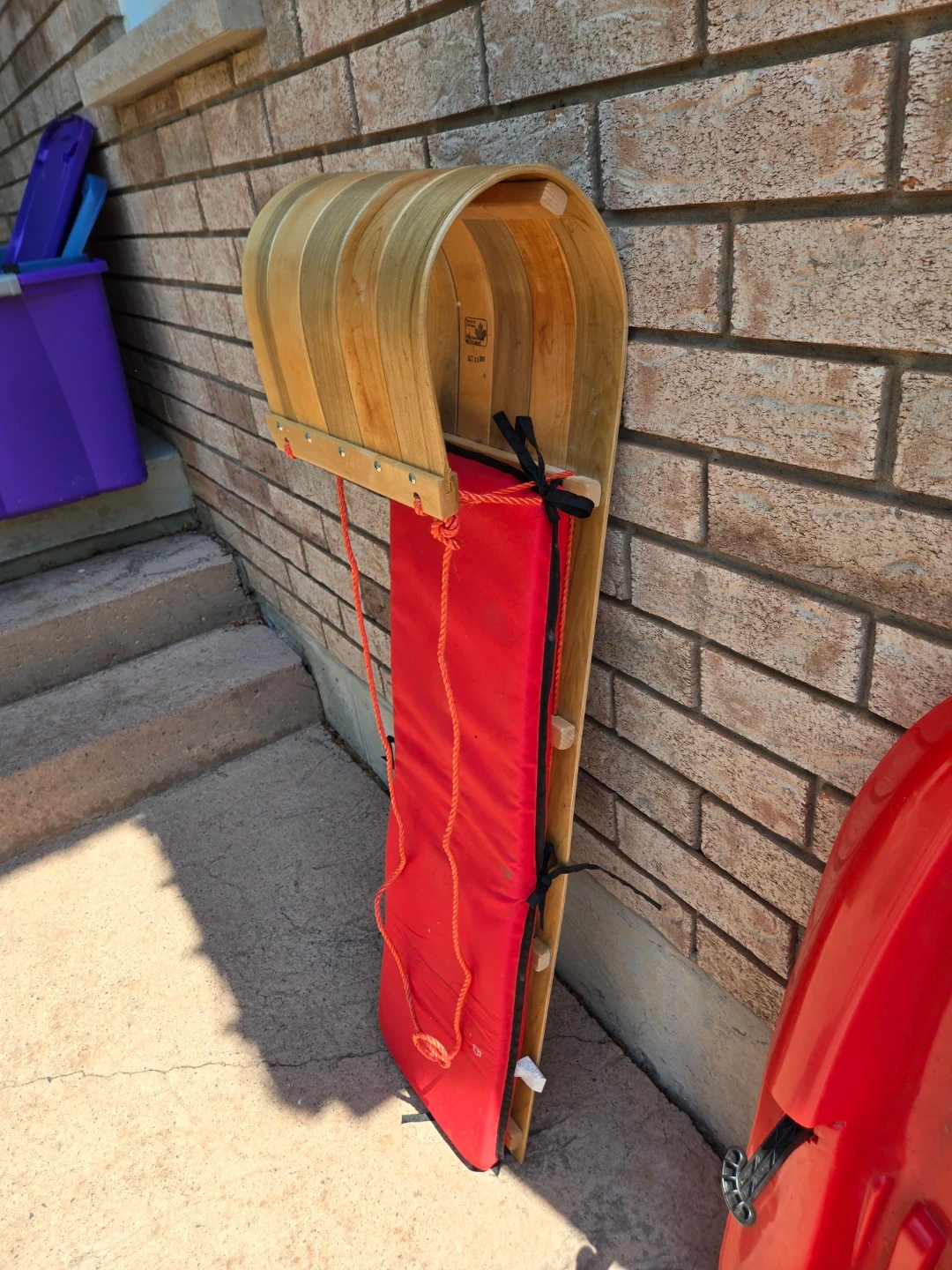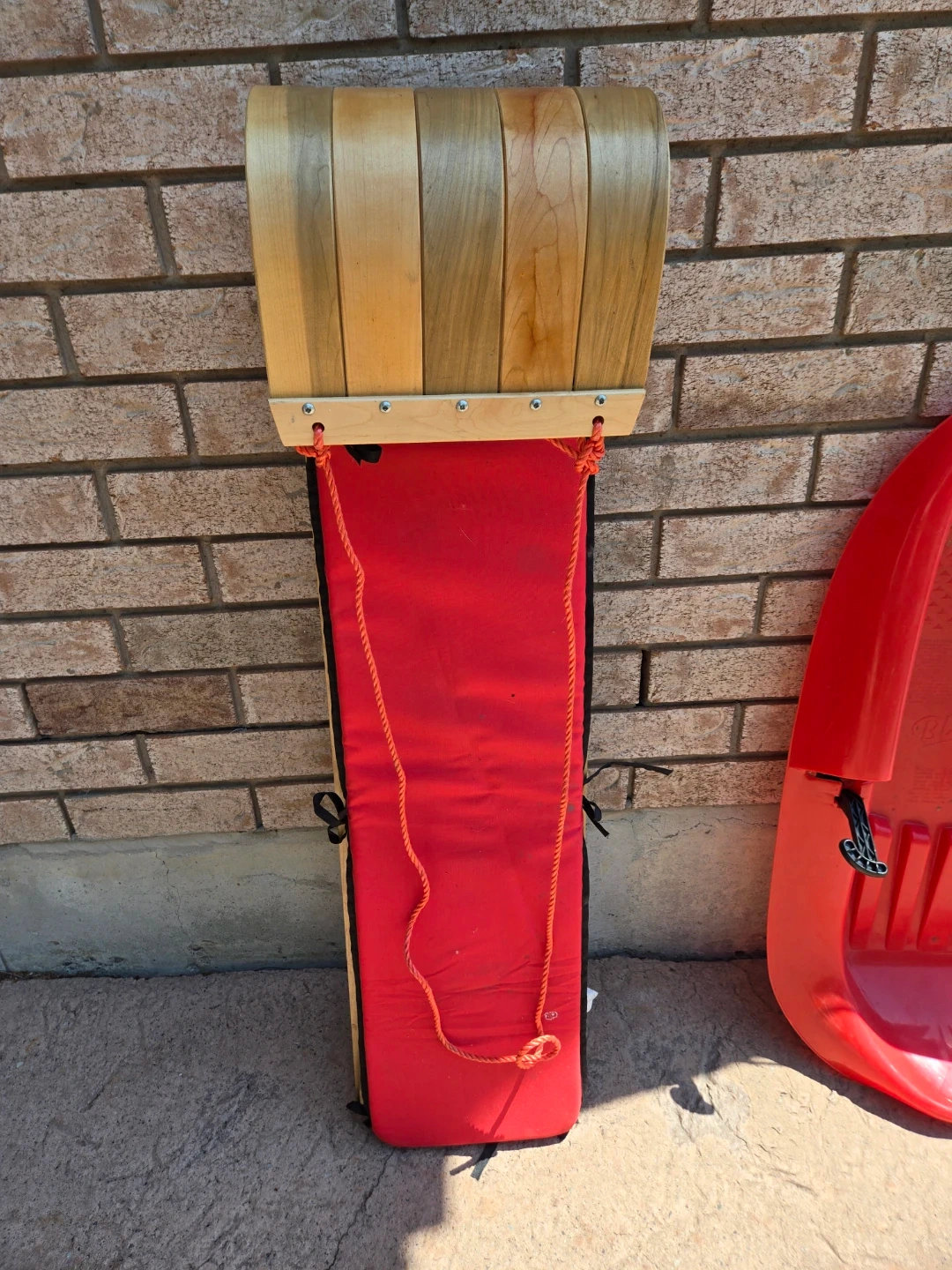 Wooden Toboggan Sled with Red Padded Seat