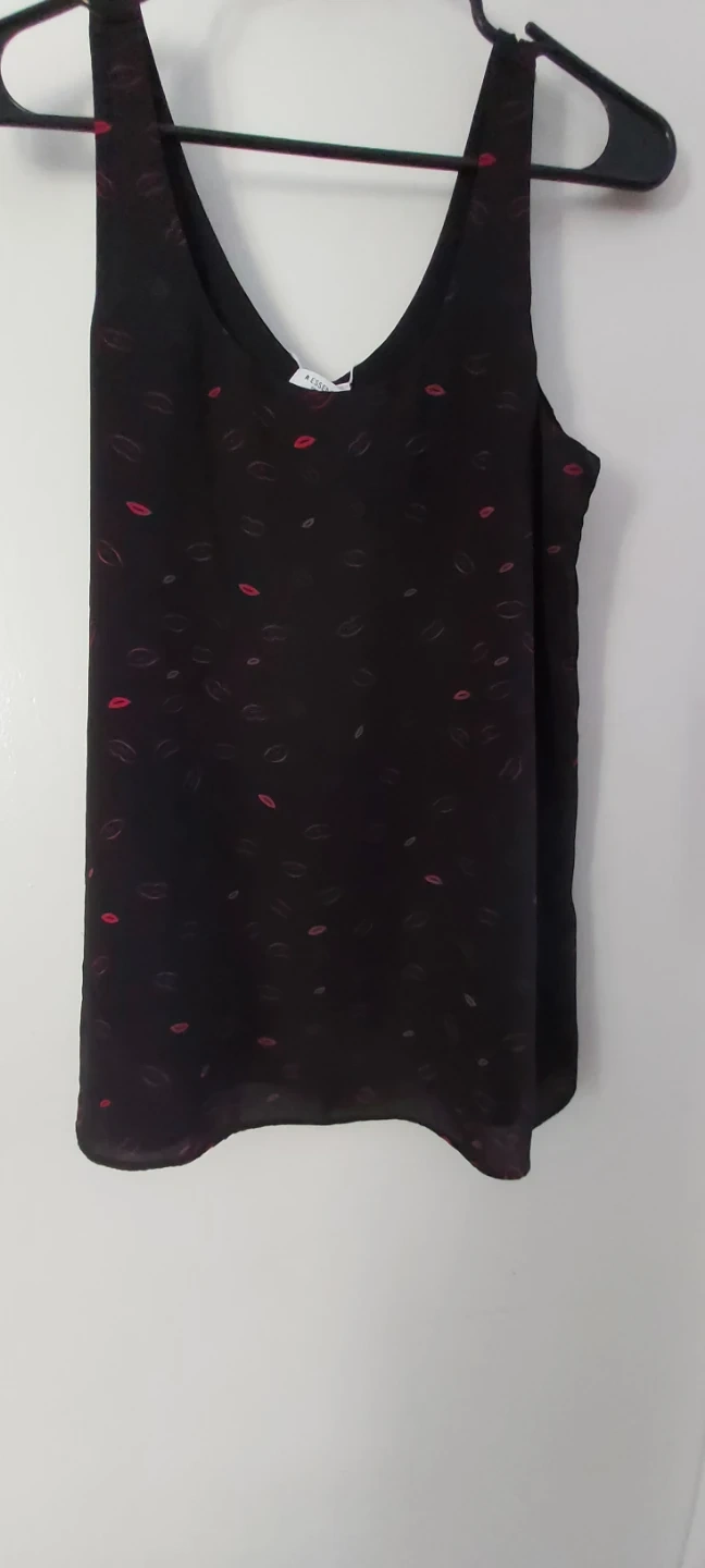 women's tops in various styles and sizes . Includes a navy ribbed V-neck sweater, a dark grey marled long-sleeve top, a black top with a cutout back detail, a grey t-shirt with a silver graphic, and a black cami with a lips print. All tops are size medium. Old navy, ricki's, la vie en rose, old navy sport