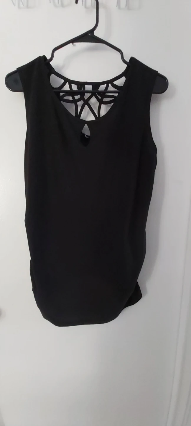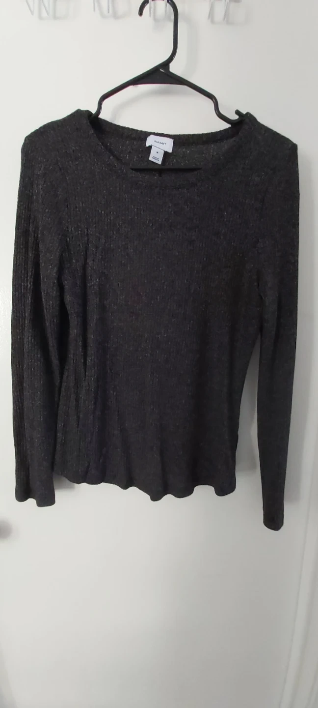women's tops in various styles and sizes . Includes a navy ribbed V-neck sweater, a dark grey marled long-sleeve top, a black top with a cutout back detail, a grey t-shirt with a silver graphic, and a black cami with a lips print. All tops are size medium. Old navy, ricki's, la vie en rose, old navy sport