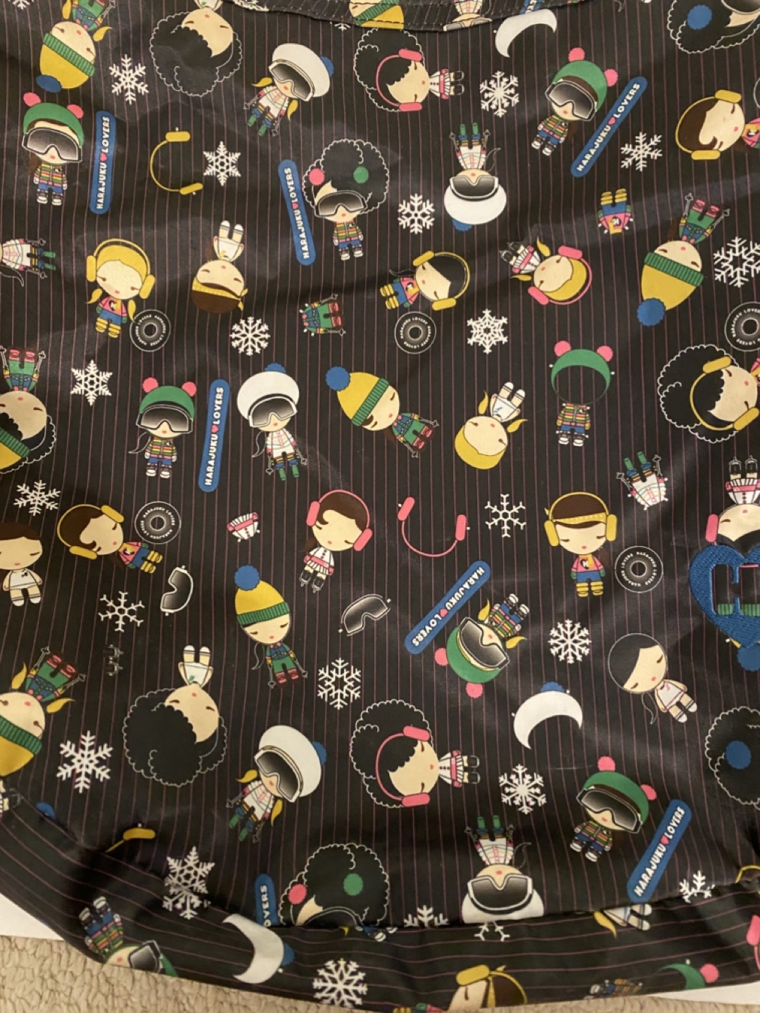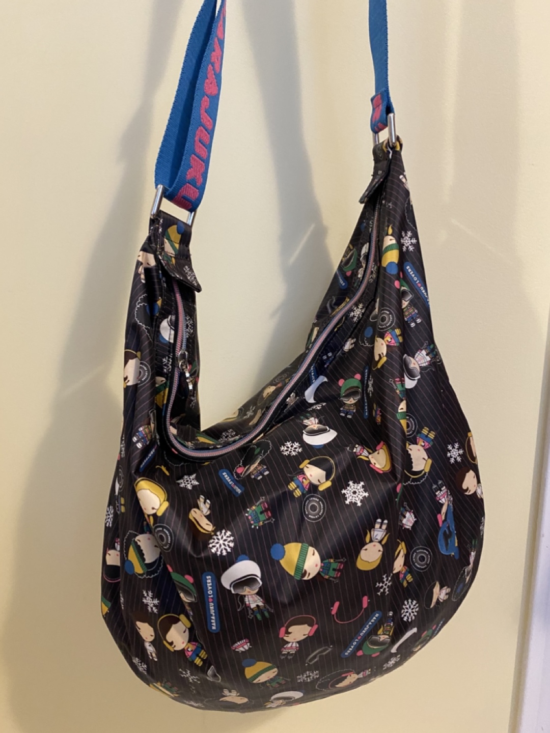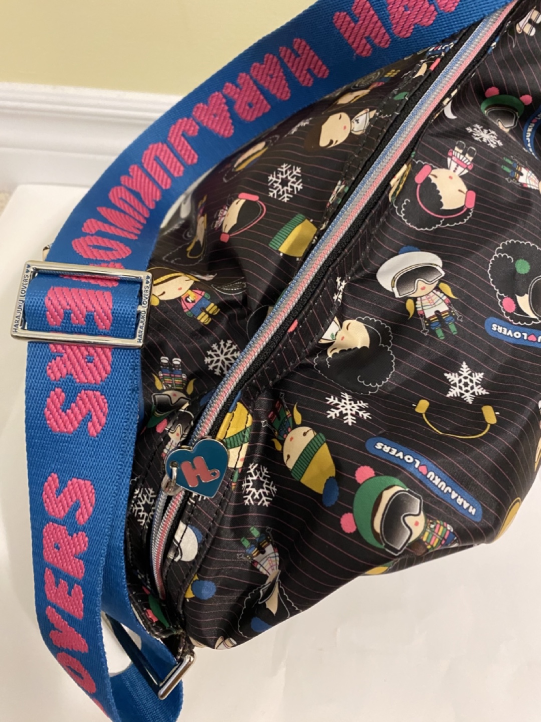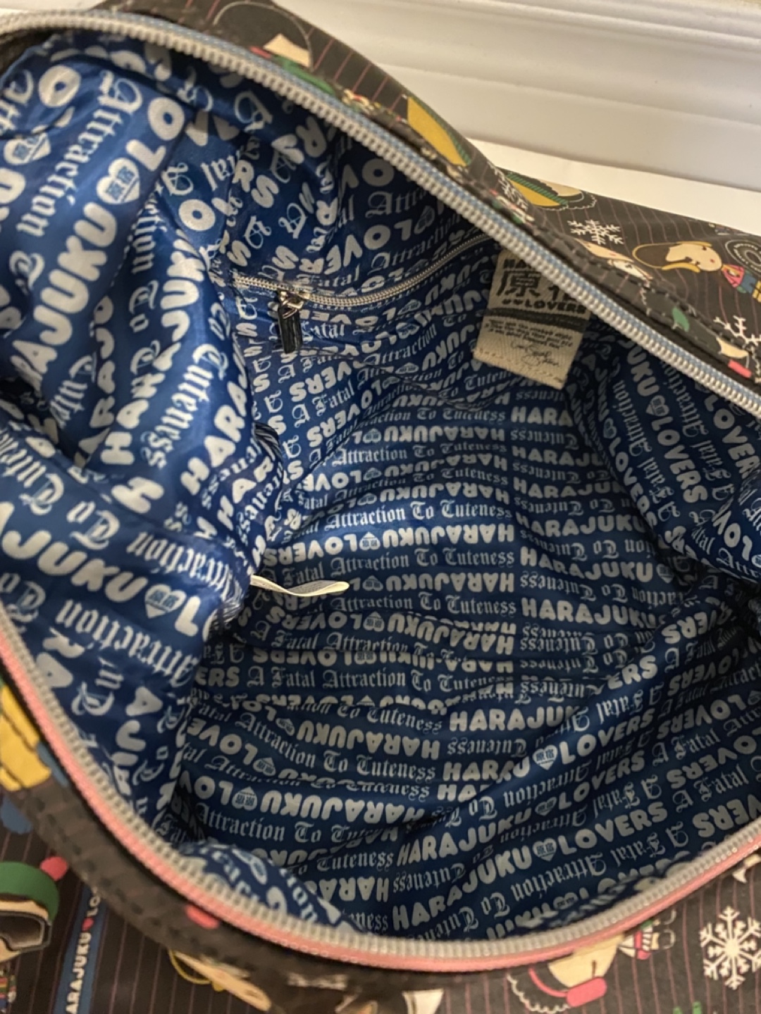 Cute Harajuku Lovers shoulder bag in a black colour with a fun pattern! The strap is blue with pink lettering, and the inside lining is a bright blue with white lettering. It's in great condition and ready for a new home