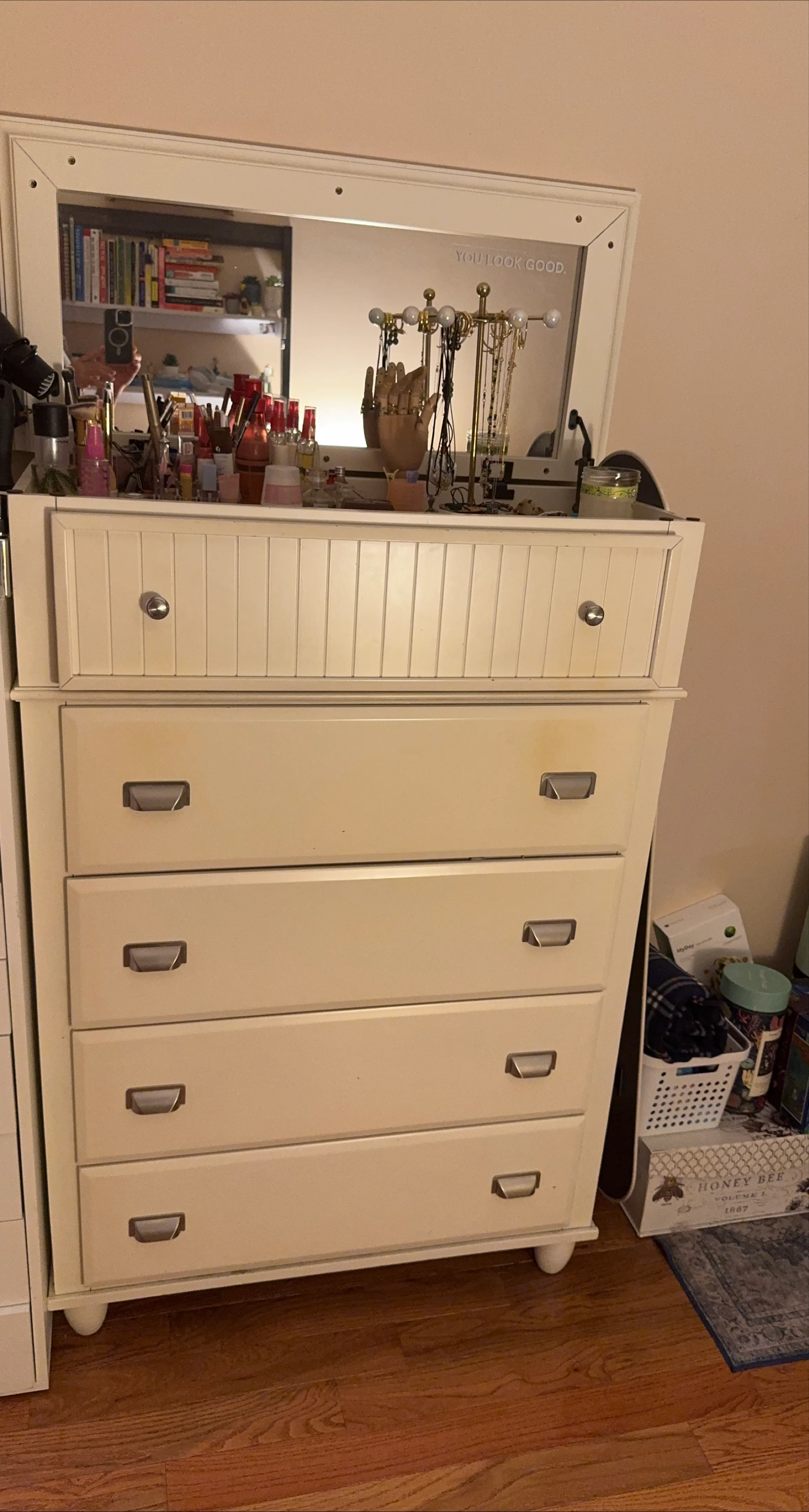 Selling a charming white dresser with five drawers and a mirror. It's a great addition to any bedroom or dressing area. The mirror even has the saying "You look good" printed on it!