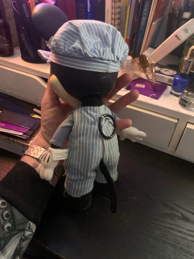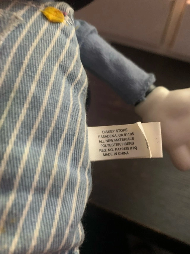 This is a used, vintage Disney Store Mickey Mouse wind up toy in good condition. He's wearing a blue and white striped conductor outfit. Wind him up and watch him go! He's looking for a new home to bring some joy and nostalgia. Cash accepted.