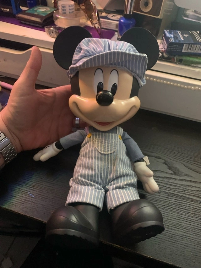 This is a used, vintage Disney Store Mickey Mouse wind up toy in good condition. He's wearing a blue and white striped conductor outfit. Wind him up and watch him go! He's looking for a new home to bring some joy and nostalgia. Cash accepted.